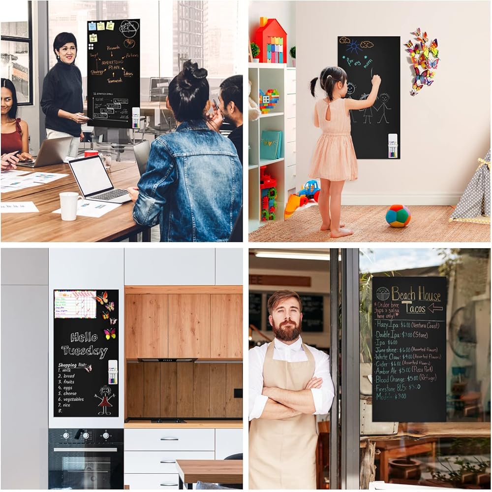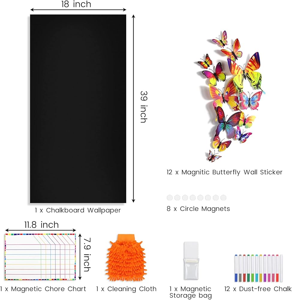 Magnetic wallboard and color-printed magnetic charts are very practical, you can arrange your time reasonably and plan your life better. You can use butterfly stickers to decorate the chalkboard wallpaper side and DIY chalkboard painting as beautiful home decorations. You can stick it on cabinet door, pantry door, homeschool room, meeting areas, playroom, porch, kitchen, RV, hallway door, closet door, office or kitchen cabinets