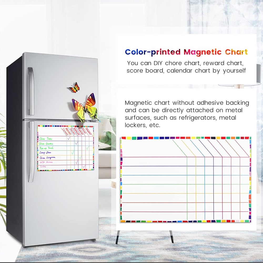 Matching color-printed magnetic chart, you can DIY reward chart or scoreboard by yourself; magnetic chart without adhesive backing and can be directly attached on metal surfaces, such as refrigerators, metal lockers, etc.; equipped with 3D magnetic butterfly decoration, which can be directly magnetically adsorbed on metal items or fixed with the provided glue dots
