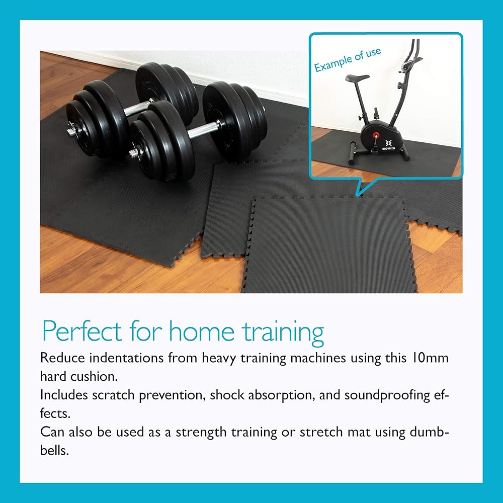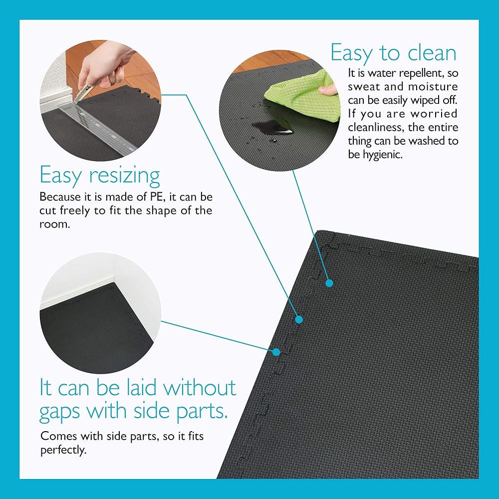 ■ Perfect for home training ・With high hardness cushion that is 1/2 thick, we prevent sinking of heavy training machine ・Demonstrates floor scratch prevention, shock absorption and soundproofing effects. ・Good for strength training with dumbbells or stretching. ■ Joint type that can be combined freely ・ Because it is made of PE, it can be cut freely according to the shape of the room. ・Side parts are attached so it can fit the room perfectly.