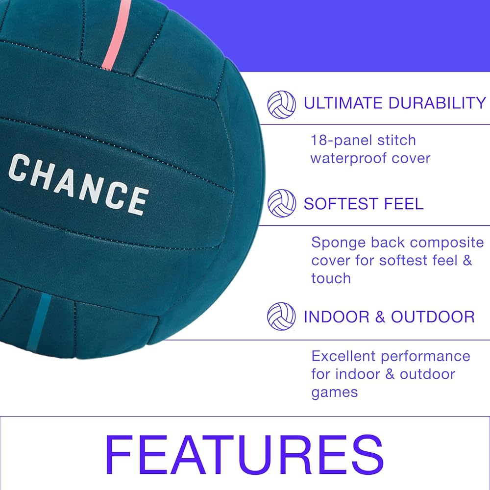 The CHANCE Soft Volleyball has colorful & durable 18-panel stitched construction and a soft foam backed composite leather cover, for a soft feel, super-soft touch & light play. Excellent performance for indoor practice & play, but also waterproof making ideal for outdoor use at the beach, pool, park or in your own backyard. A butyl bladder locks in air for optimal ball pressure and shape, enabling a solid strike every time (ball comes deflated, air pump and inflation needle NOT included). The best addition to your volleyball training equipment so you can become the next beach volleyball all-star!! How often do you lose or confuse your beach balls? Not with Chance. Our unique colorful volleyball designs will make yours standout! Perfect volleyball gifts for teen girls & volleyball fans.