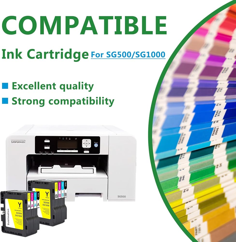 Compatible printer: compatible ink cartridge for Sawgrass SG500 and SG1000 printers.The cartridge uses the latest upgraded chip. It can be used for printers with firmware upgrades.