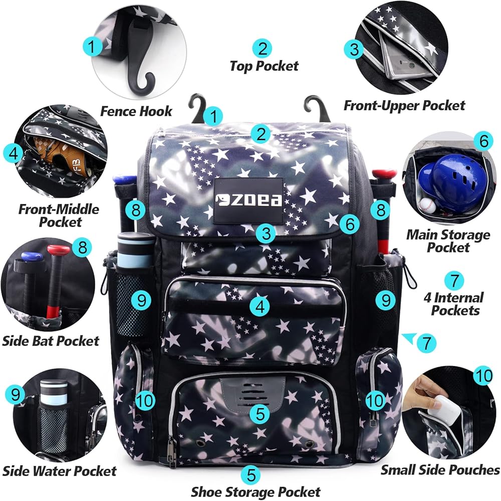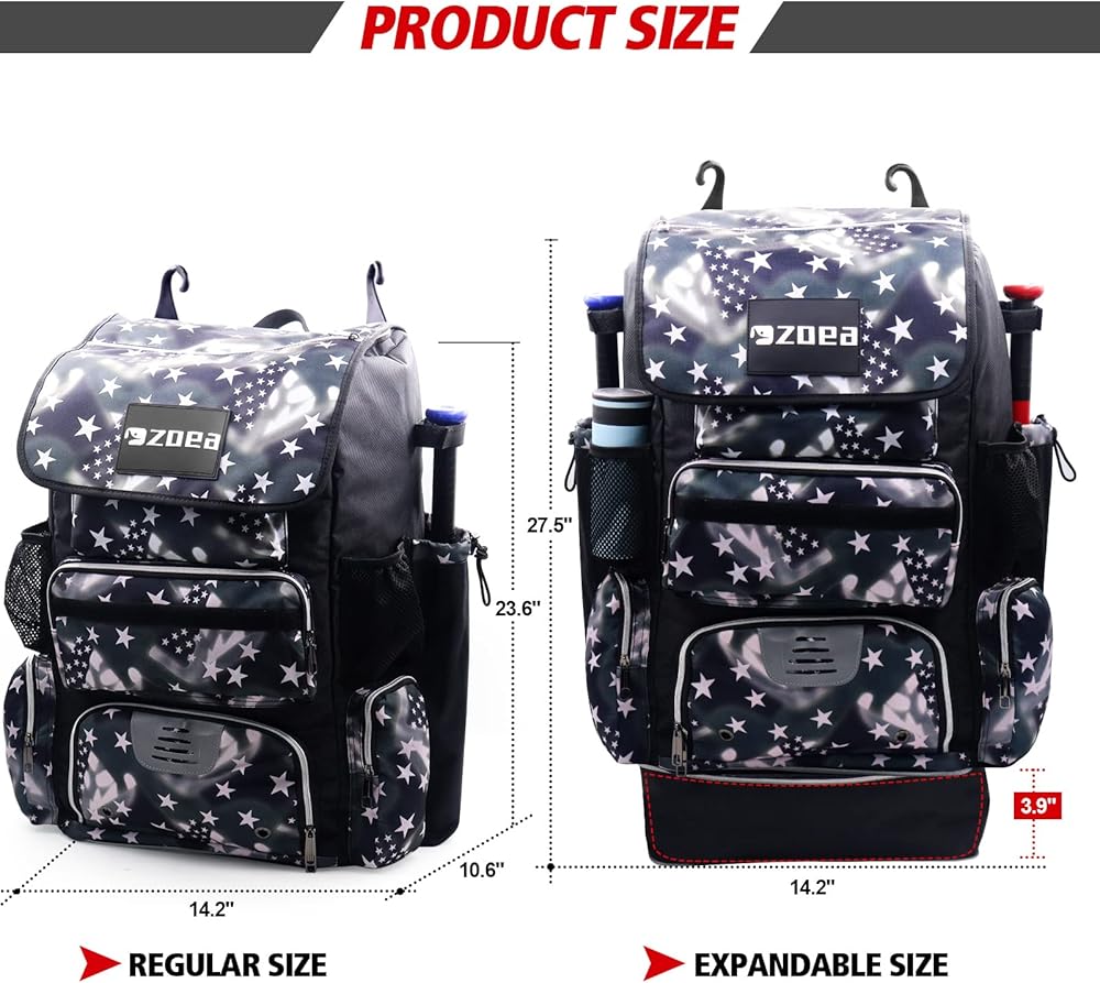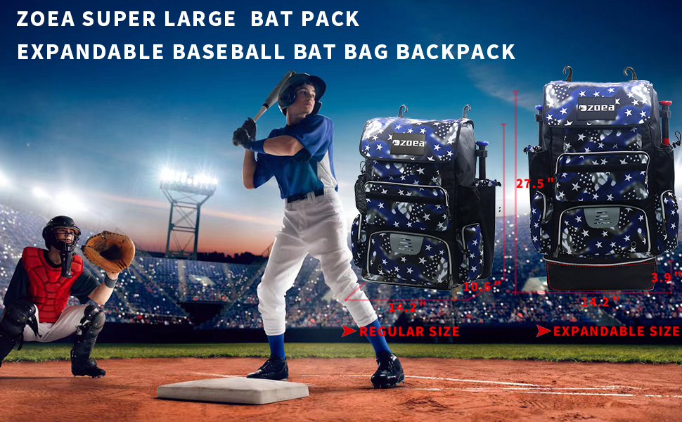 Expandable & Extra Large Capacity - ZOEA baseball bat backpack bag has a spacious main compartment for carry all essentials for baseball bag each bag stores 4 bats, a baseball helmet, batting gloves, cleats, baseball cap, and catching glove.Large Baseball and Softball Gear Bag with expandable storage space when you need it.