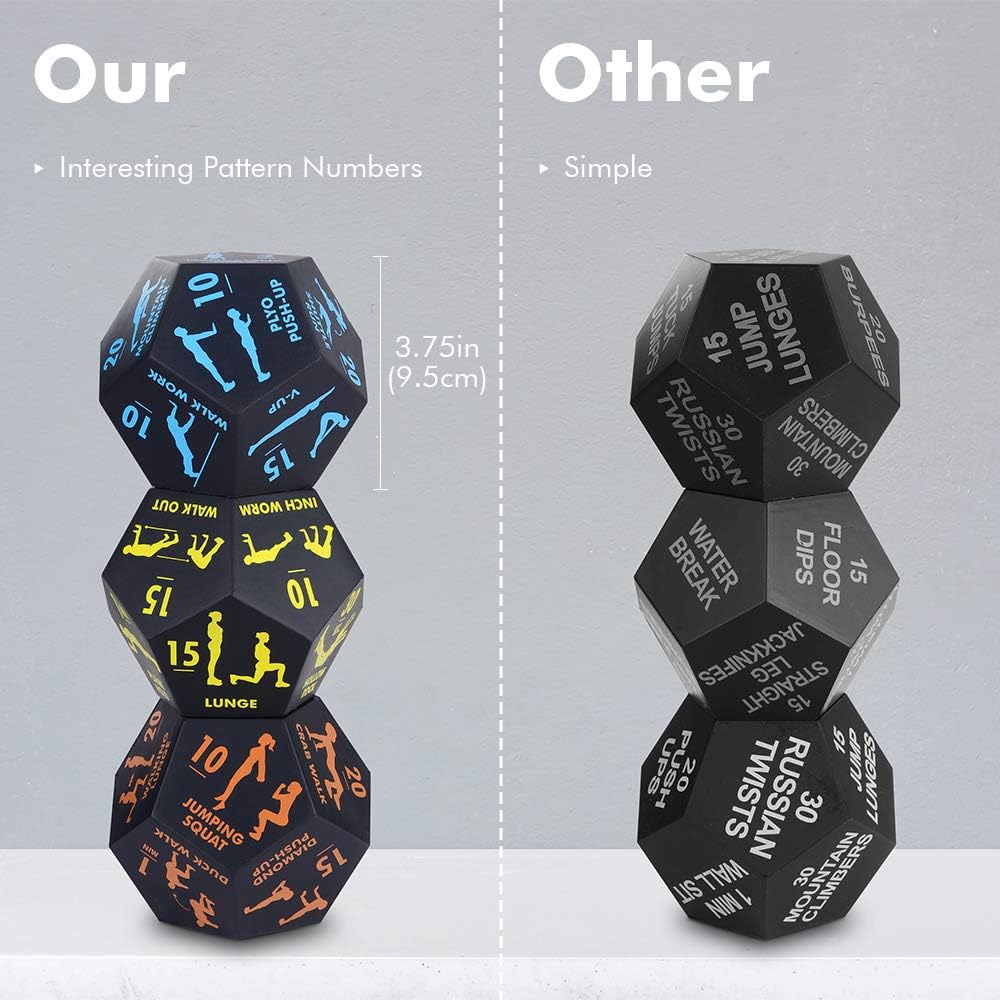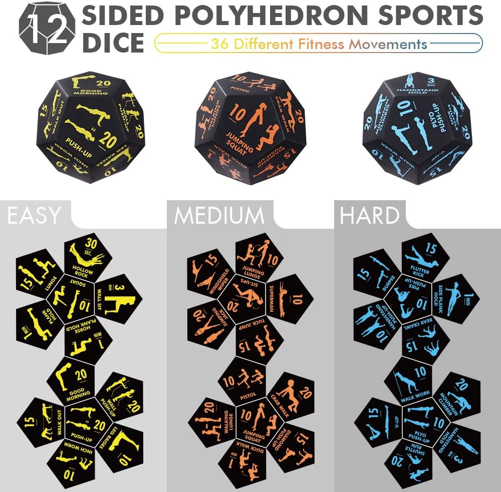 🎲【حافظ على متعة التمرين】يعد نرد اللياقة البدنية ذو 12 جانبًا بإضفاء الإثارة على روتين التمرين الخاص بك من خلال رمي النرد. تمارين ومجموعات مختلفة. حافظ على لياقتك في المنزل بينما تستمتع! (سهل ومتوسط وصعب)
