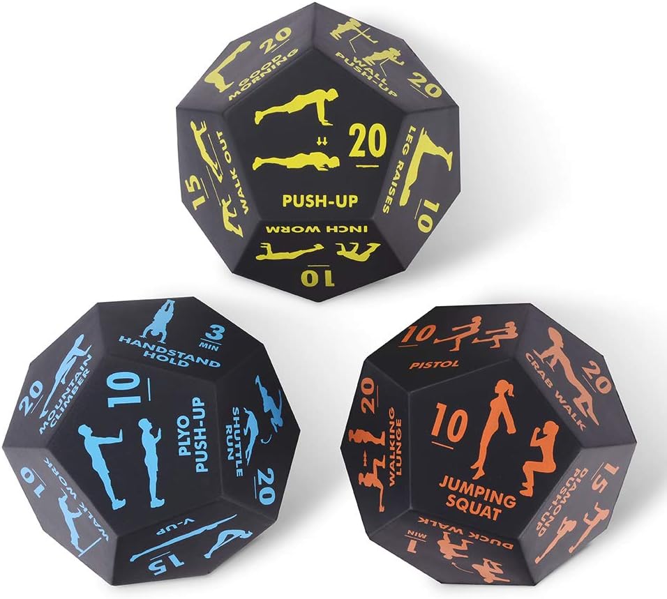 نرد التمارين الرياضية، للياقة البدنية المنزلية، والتدريبات، وتمارين القلب، ونرد الحركة ذو 12 جانبًا، لعبة تعلم الصالة الرياضية الممتعة لفصول اللياقة البدنية والتمرين، مع كتيب توضيحي للتمرين (3 قطع)