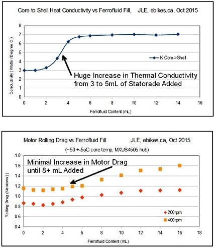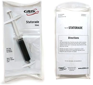 The idea behind Statorade is brilliant and simple. A direct drive hub motor generates heat internally at the stator, but this heat has no easy path to escape since it is surrounded by trapped air. It is possible to cool the motor with vent holes and active airflow from outside, but this exposes the motor to the elements. Alternately, filling the motor with oil will cool the stator windings quite well, but with significant increase in motor resistance from fluid drag and an enormous sealing challenge to keep the oil from leaking Statorade is a unique ferrofluid from Grin Technologies that is designed to increase dissipation heat from hub motors. This increases power output capabilities, efficiency, and longevity. This 10mL Syringe of Statorade ferrofluid is for use in cooling direct drive hub motors, with convenient Luer Lock plastic nozzle for injecting into holes as small as 2mm diameter. Approximately 5mL of this fluid injected into a hub motor will more than double the ease of heat flow from the stator of your motor to the motor shell without any noticeable increase in motor drag.