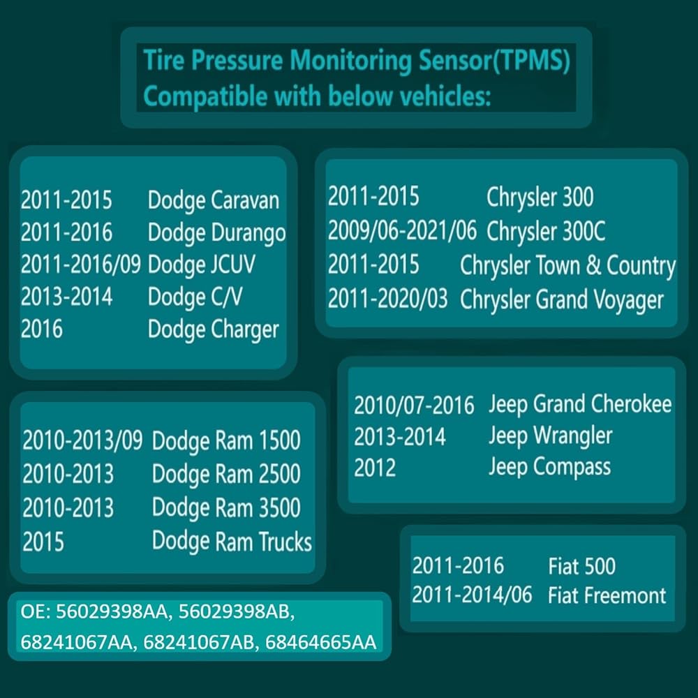 【Extensive Compatibility】The Tire Pressure Monitoring Systems are available on most Jeep, Chrysler, Dodge, Fiat and RAM models (See figure for specific models). Please check the table for applicable models and specific years before purchase, in order to avoid unnecessary installation costs.