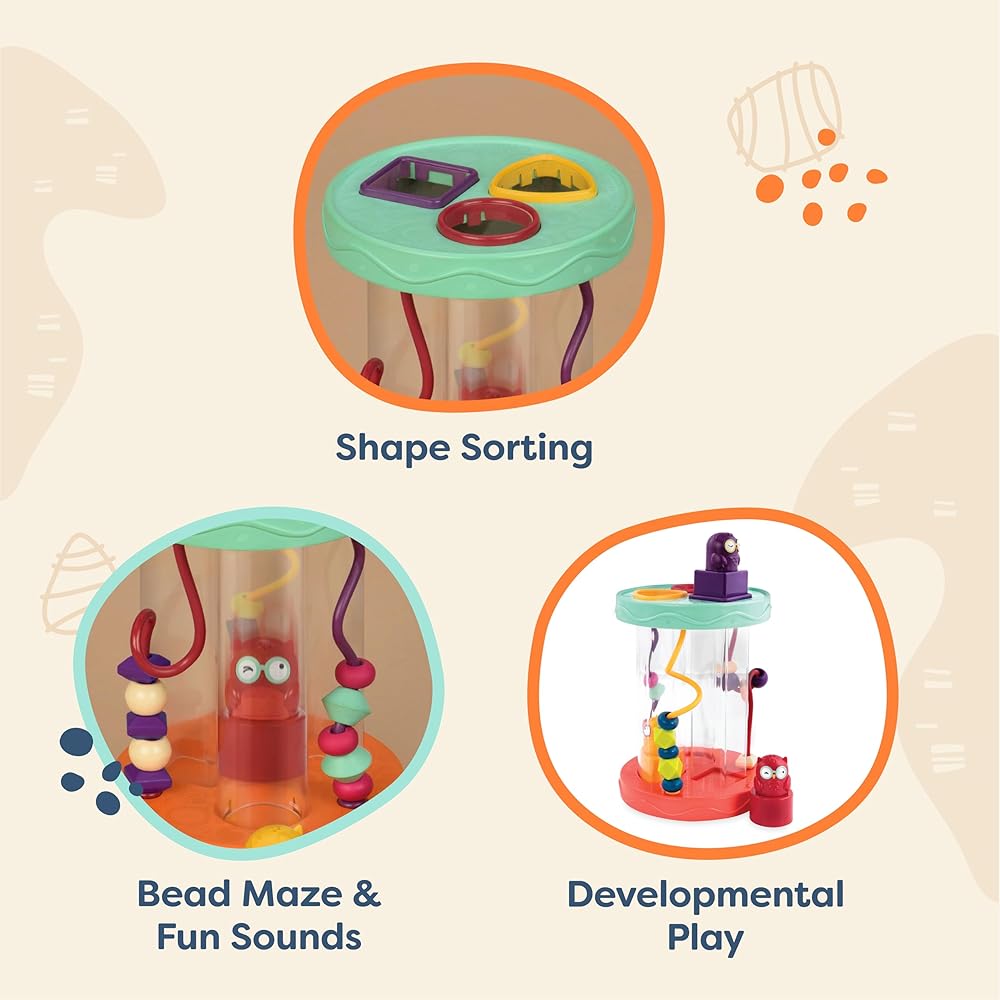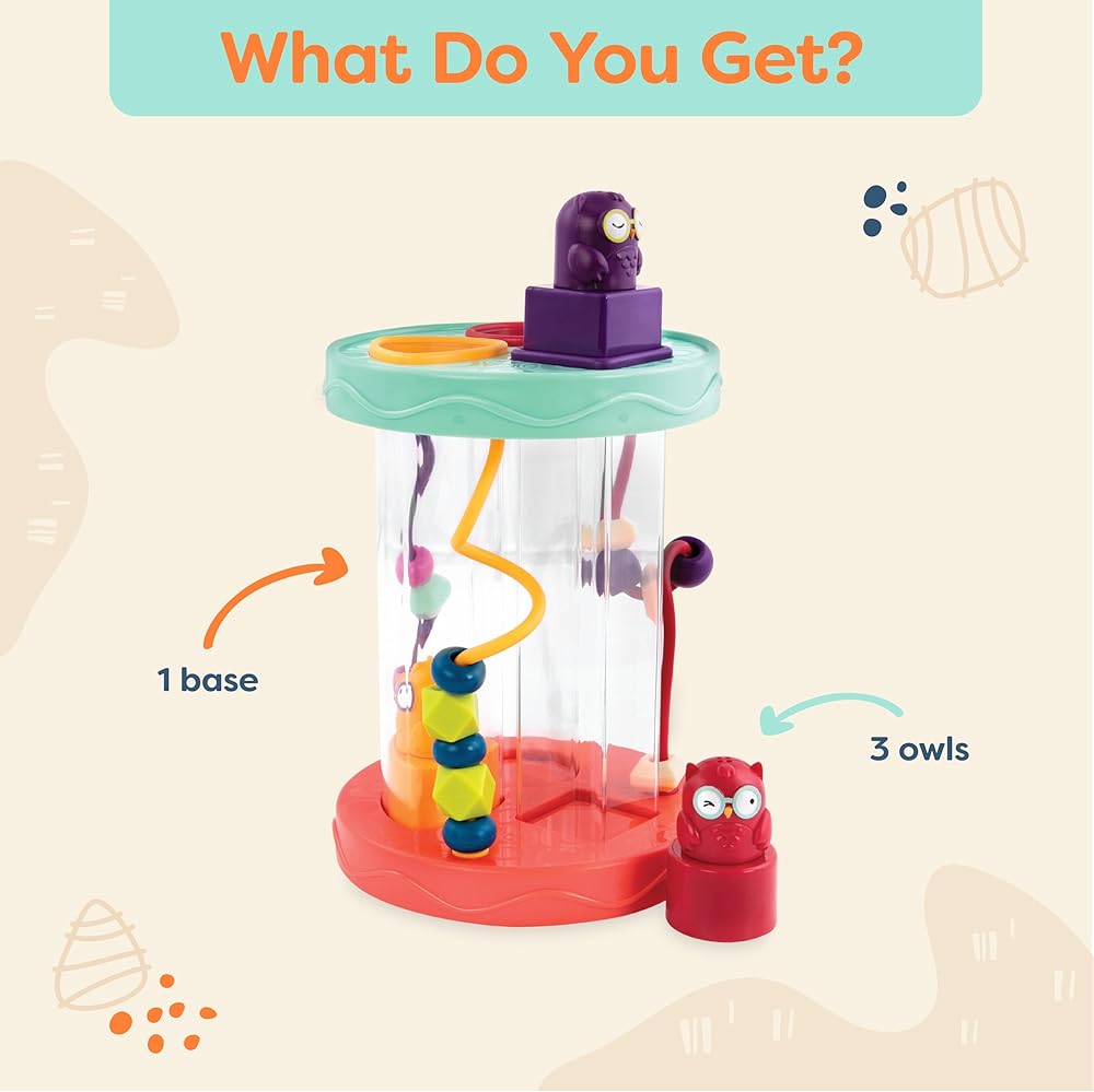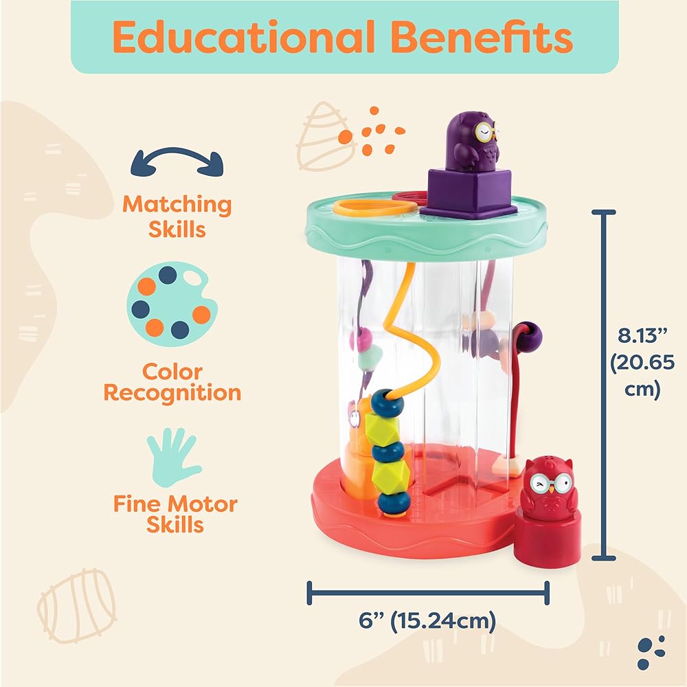 Slide three little owls on their perfectly shaped perches and hear their little hoots as they slide, then dump them out to start again. Each owl is uniquely designed and features its own colors and sound so the hooting excitement keeps going. Your child will learn how to sort based on color and shape with this toy. They insert the owl into the correct color coded slot and are rewarded with a funny sound. The Hooty Hoo also features pattered and textured activities to help them develop all of their senses. This toy is designed for children as young as 6 months old. That means there are no sharp edges or dangerous pieces, and the whole thing rolls perfectly across the floor for minis on the move. As your child grows and moves this is a perfectly safe and sound for years to come. B. Toys creates unique toys for children inspired by the world around them. Their goal is to be bigger than a toy company by giving children the chance to be themselves and express their feelings constructively and with fun and excitement. B. Toys Hooty Hoo Shape Sorter with Sound includes three different owls with their own hoots. This toy measures 6 inches in diameter by 8.125 inches in height. IT is designed for children age six months to three years.