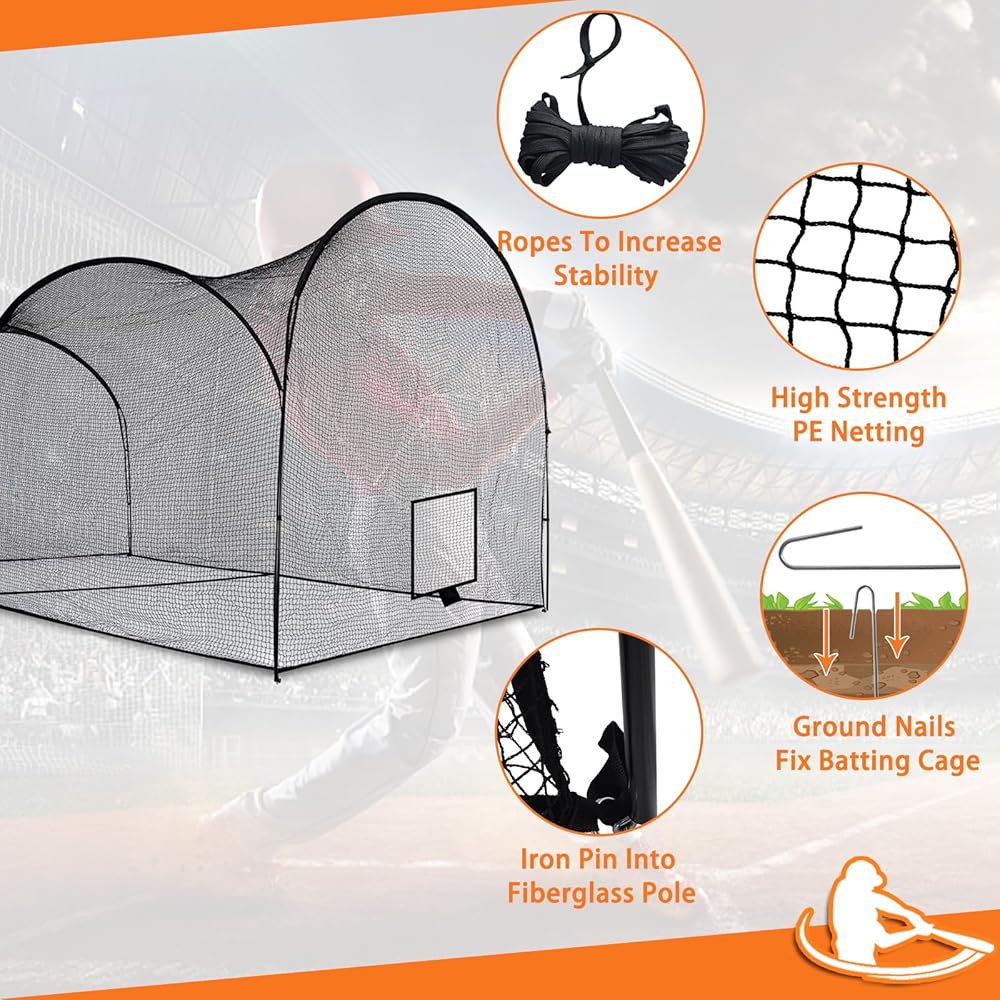 🔶STABLE AND SOLID BATTING CAGE -- This baseball batting cage uses a durable steel construction to ensure sufficient support, making it more solid and stable. The softball batting cage is equipped with ground nails, which is no problem even in windy weather. The high-strength nylon netting ensures that it can withstand a strong hitting.