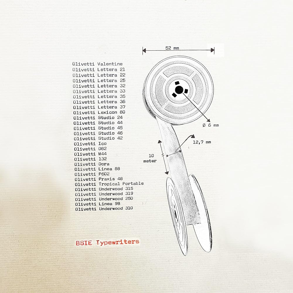 Ribbon for Olivetti typewriters. Sealed air. High quality ink for the best typing prints. Easy to fit into your Olivetti Typewriter. Fits following typewriter models: Olivetti Valentine Olivetti Lettera 21 Olivetti Lettera 22 Olivetti Studio 24 Olivetti D82 Lexicon80 Olivetti M44 Olivetti 132 Olivetti Dora Olivetti Lettera 25 Olivetti Lettera 32 Olivetti Lettera 33 Olivetti Lettera 33 Olivetti Lettera 35 Oliven etti Lettera 36 Olivetti Lettera 37 Underwood 310 Underwood 315