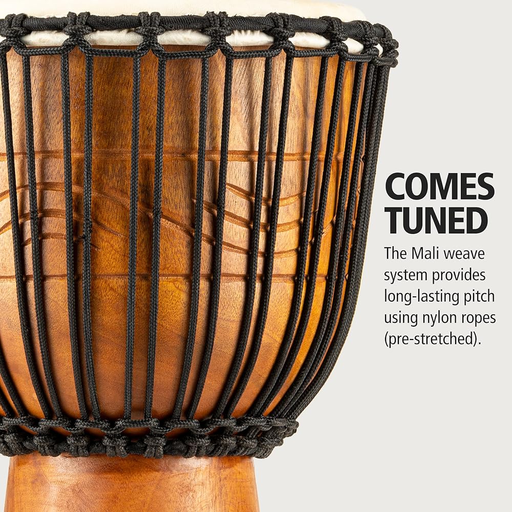The Meinl Water Rhythm Series Original African Rope Tuned Djembe is hand carved and finished in light brown. This high quality instrument is crafted with great attention to detail and provides an outstanding, full-volume sound. The Meinl Original African Style Rope Tuned Djembe is made from a solid log of plantation grown Mahogany. This wood species has the proper density and stability to assure a high quality Djembe from sustainable sources. Our Djembes are headed with hand selected shaved goatskin. The traditional Mali-Weave tuning system with pre-stretched HTP rope is an easy and reliable way to keep the Djembe in tune. The Djembe is first formed on a lathe. The body is then carefully shaped by hand for a perfect bearing edge and proper interior contours. These factors are critical for optimum sound characteristics: Deep bass notes, full clear tones, and crisp cutting slaps, all without unwanted overtones. This Meinl Original African Rope Tuned Djembes come bundled with a professional quality Djembe bag. The bag is specially constructed from heavy duty nylon with a side pocket and super-sturdy zippers. If the bag is too much protection, try our Professional Djembe Caps. These are elasticized covers to protect the head and bearing portions of the Djembe. They are very sturdy, yet compact and easy to use. The Djembe may be played on our ST-DJEMBE Steely 2 stand or on our TMD Professional Djembe stand. An alternative is our MDJS-1 Professional Djembe strap. This comfortable strap holds the Djembe to your body, leaving you free to move around.