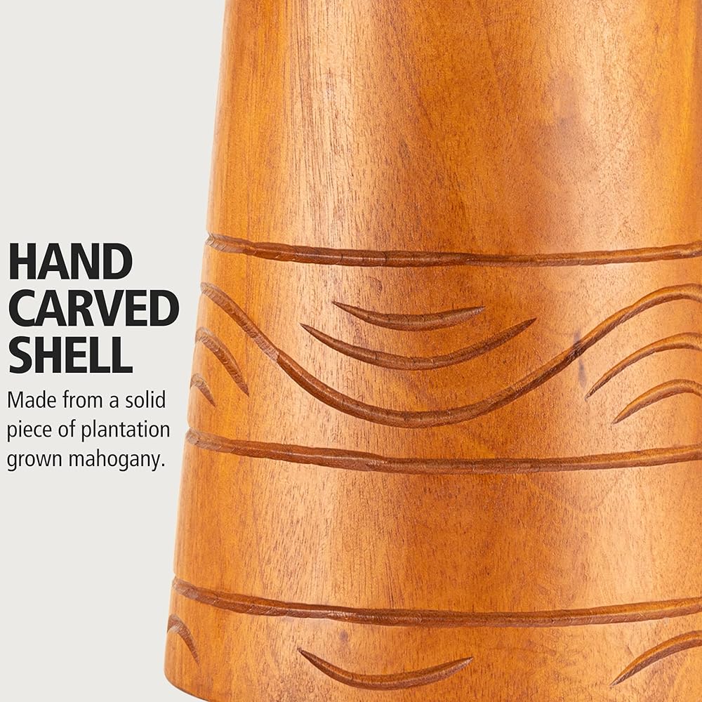 ZOOM IN: the shell is hand made out of a single piece of solid mahogany from certified managed forests (NOT glued together wood pieces); the exterior is beautifully hand carved and looks great for decoration in your home or studio