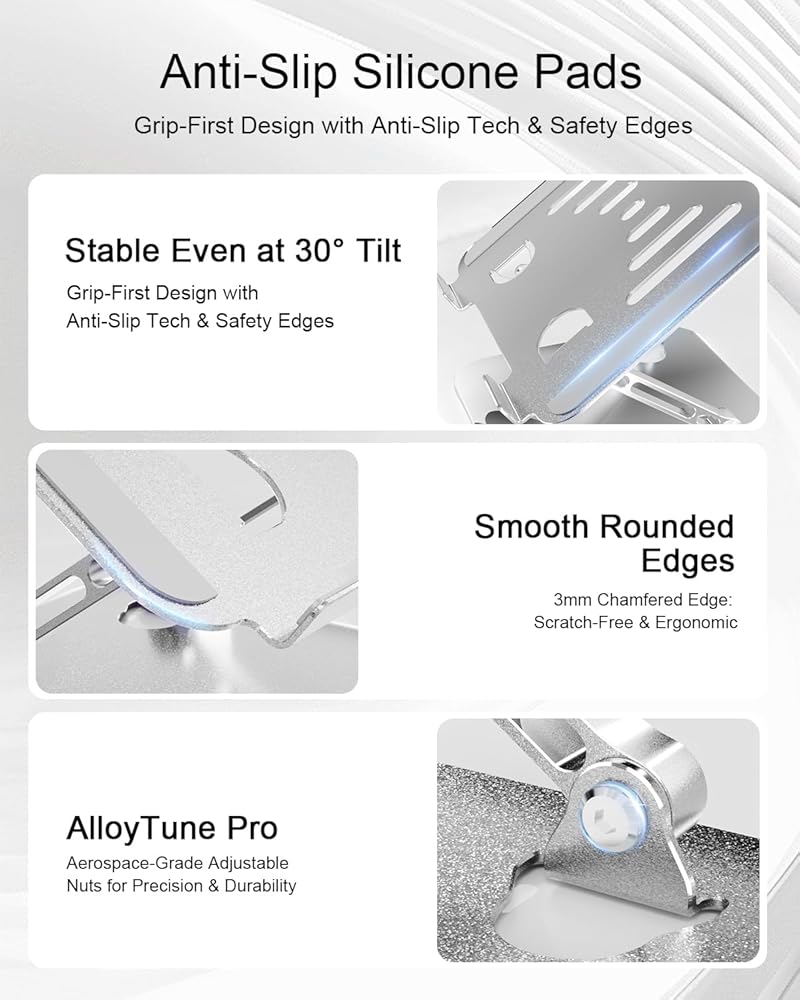 Heat Dissipation - Our laptop holder features multiple ventilation holes design that allows for optimal airflow, keeping your laptop cool even during intense tasks. Anti-skid silicone and smooth edge can protects your laptop from sliding and scratches. Elevate your laptop experience with our exceptional laptop stand.