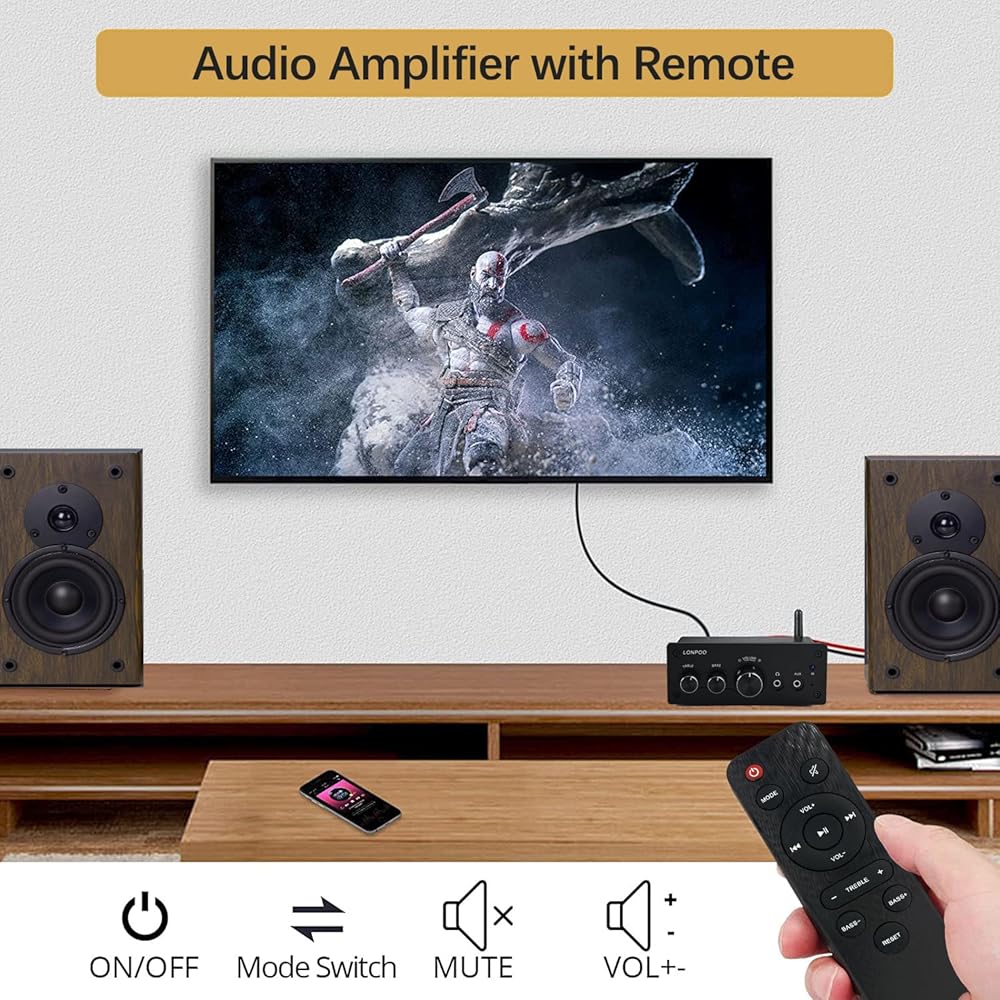 Bluetooth Audio Amplifier,LONPOO 2.0 Channel Mini Class D Integrated Amp for Bookshelf Speaker with Optical Port,Coaxial Jack,USB Playback,Aux-in,200 Watts RMS (Metallic)