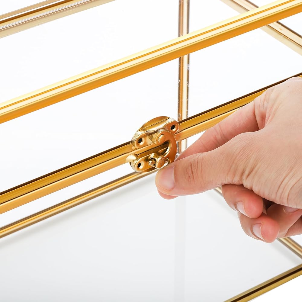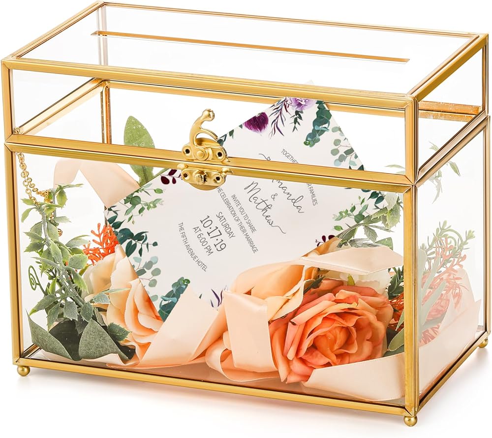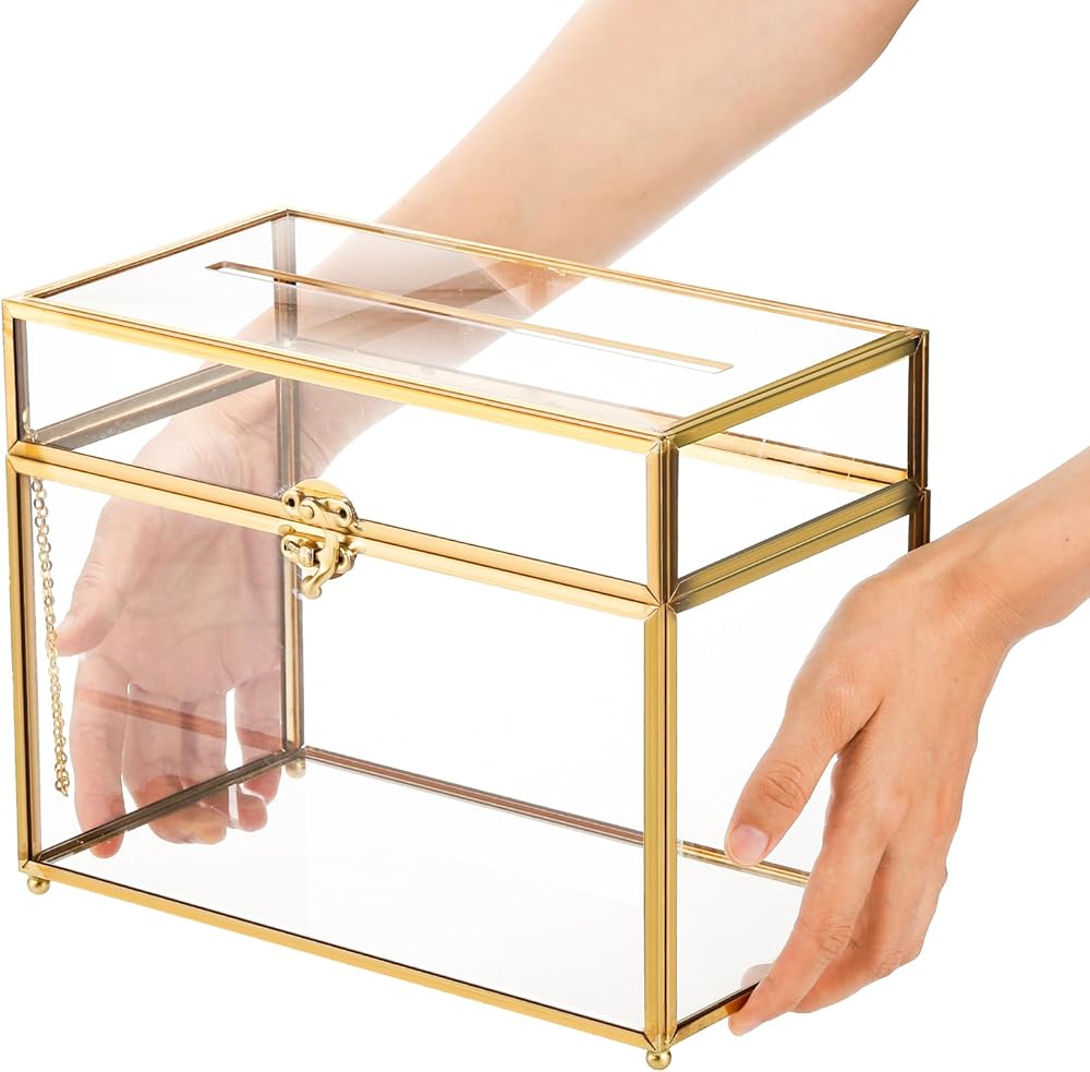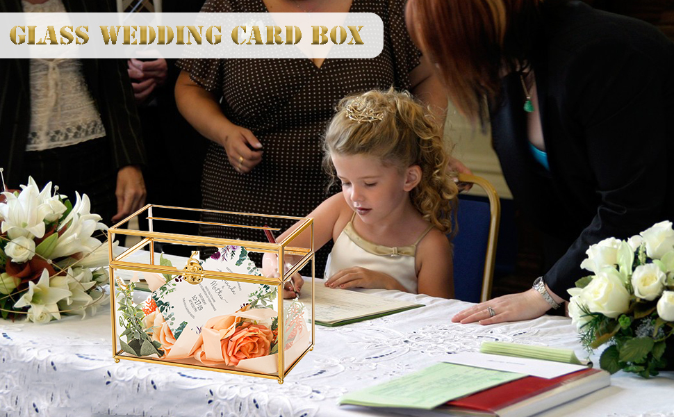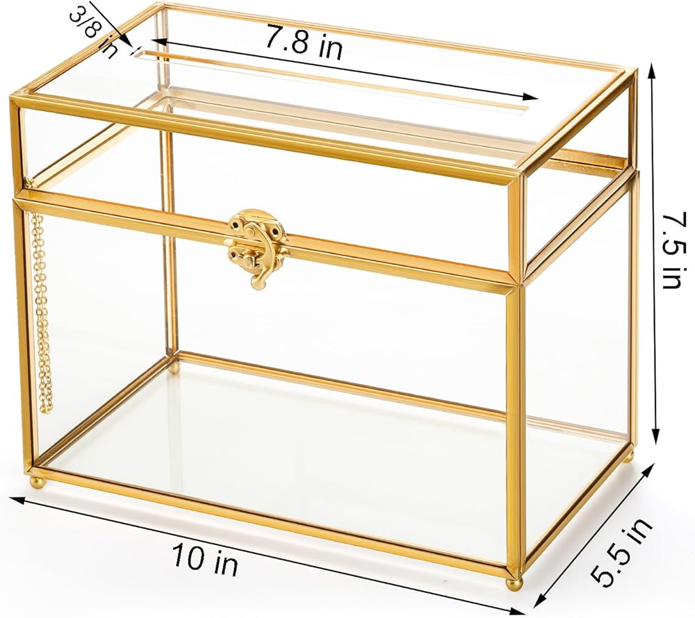 The gold card box is made from high-quality glass, sturdy not break easily, allowing a glimpse of the precious contents inside. The clear glass panels are delicately accented with a luxurious gold rim, adding a vintage and opulent feel to your special day.