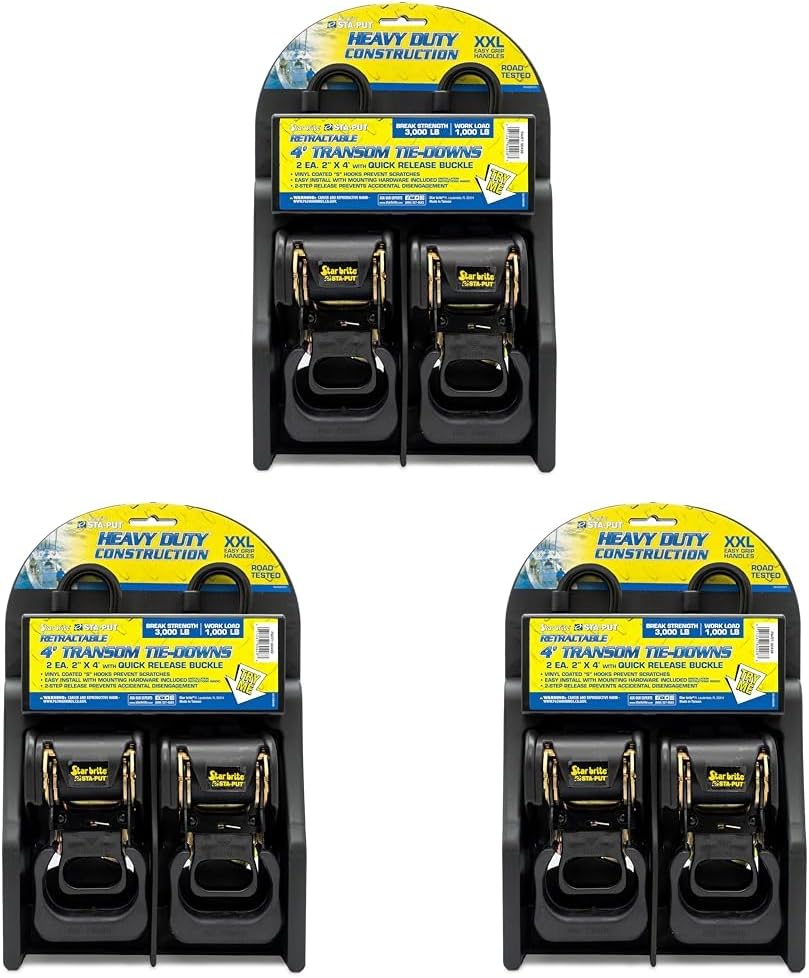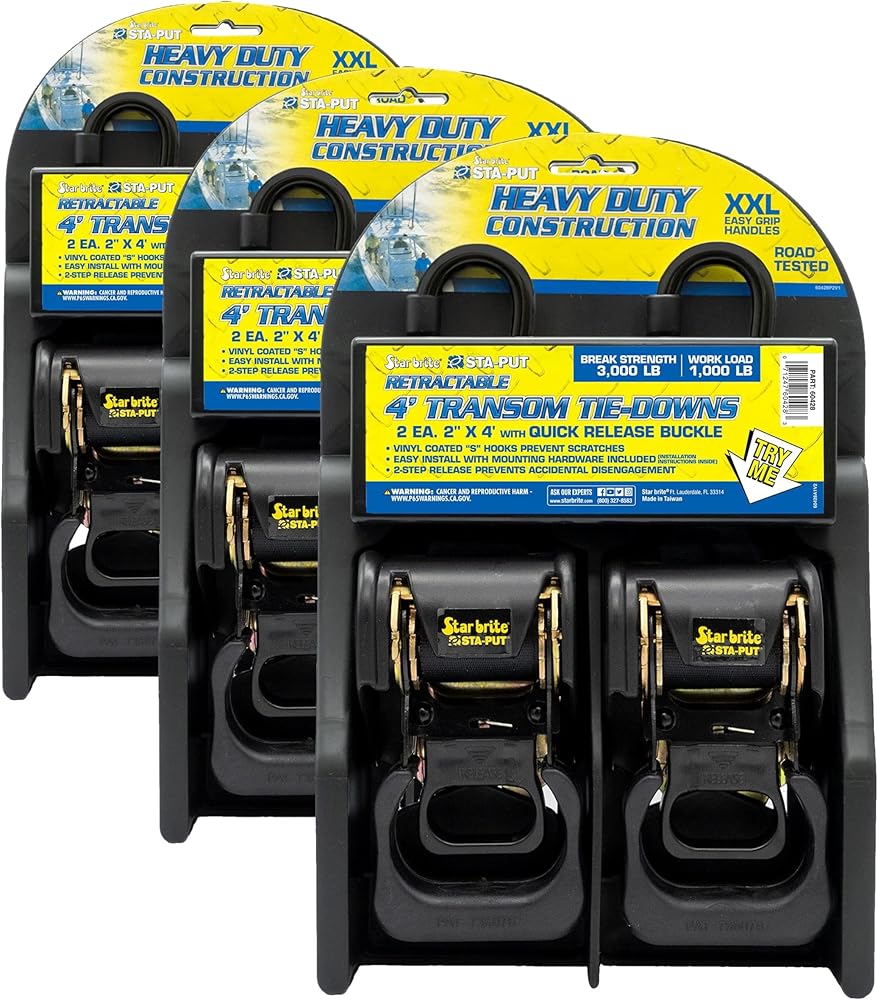 2 Inch heavy duty stainless steel retractable tie-down. Secures the transom of the boat to the trailer. Vinyl-coated "S" hooks. For best use on bass and high performance boats. Sold in pairs.