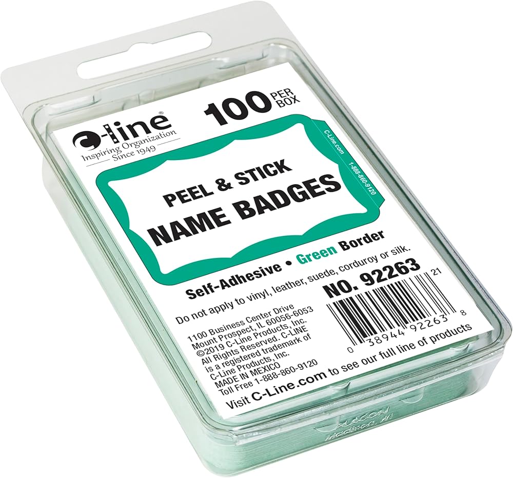 Pressure-sensitive name badges are ideal for small meetings, seminars and conferences. Unique tabbed edge makes it easy to peel off backing. The top, vibrantly colored border prompts "HELLO my name is" in white. Each badge offers a large space to write a name below that prompt and above the bottom border. Special paper adheres to most fabrics. Do not apply to vinyl, leather, suede, corduroy or silk.