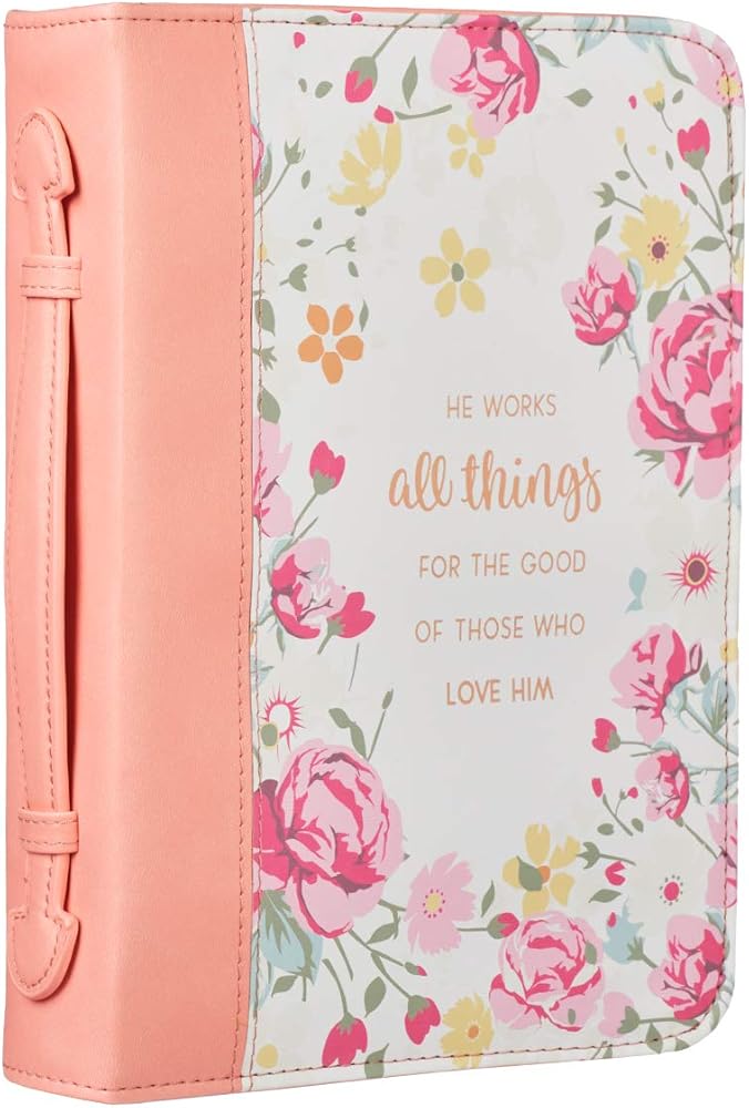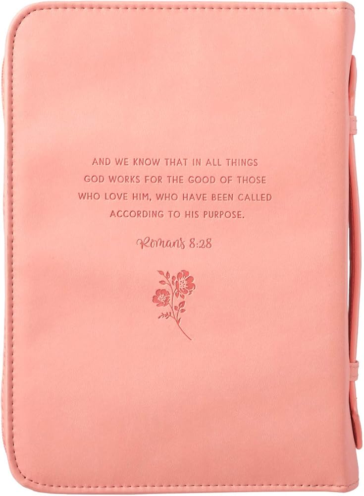 Scripture Bible Case: This stylish peach case features scripture sentiment from Romans 8:28 in gold-foiled lettering on a rose design on the front panel and the full verse debossed on the back.
