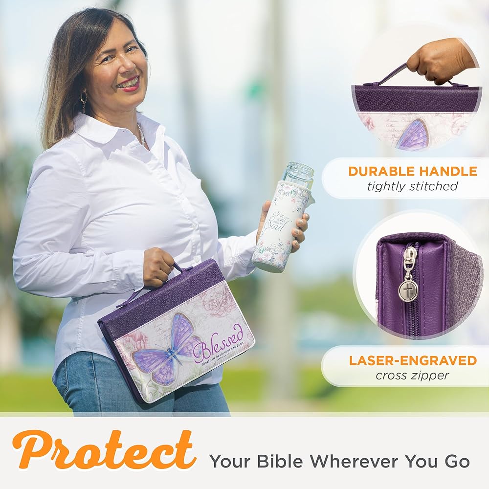 The Purple Botanic Butterfly Blessing Bible Cover features the artwork of Jane Shasky, with her fresh botanicals embellished with elegant calligraphy fashioned as a "carte postale" serving as a background for a signature purple butterfly. The Jane Shasky design is silk-screened on the coated front panel. The body of the cover is embossed with flowers. There is an exterior zipper with a cross engraved zipper-pull, a convenient lay-flat spine handle and 2 pen loops inside. All man-made materials. The Large size comfortably holds all popular Bibles such as The New Spirit-Filled Bible, The Life Application Study Bibles and the NIV Study Bible, as well as many other books and Bibles up to 9.50 x 6.75 x 2.25 inches.