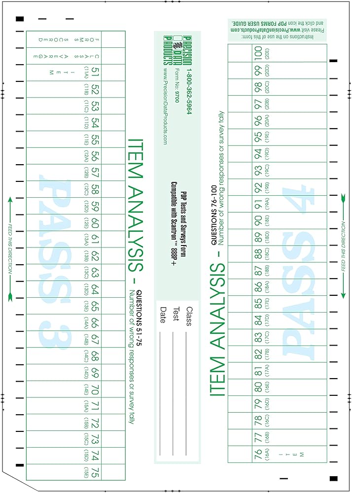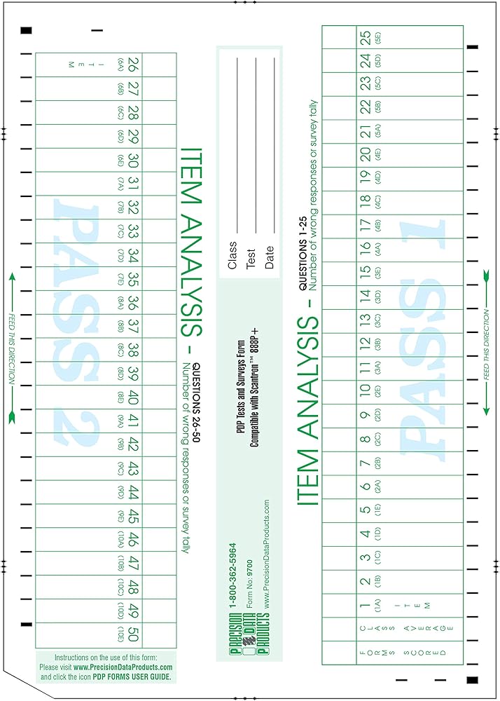 Form Number: 9700 Form Size: 8½" x 12", 2-sided Form Description: Accommodates 100 Items (50/side) Two passes each side 888P, 888P+, Scantron Score compatible 100 SHEET PACK Qty 100 - 100 Question Scantron Compatible Item Analysis Forms 1-50 on front 51-100 on back. This form is run through after all the test have been scored, and will give the instructor a better understanding of the test for the class as a whole. Forms Scored, Class Average and the the number of tests that incorrectly marked a specific question Typical Process 1 Scan front and back of key 2 Scan front and back of first test 3 Scan front and back of second test etc... 4 Run the Item Analysis Sheet through, Pass 1, Pass 2, Pass 3, Pass 4. Compatible with the Scantron 888P+ Scanner.Shipped shrinkwrapped in a hard paperboard mailer to prevent damage. Will ship separately from forms order.