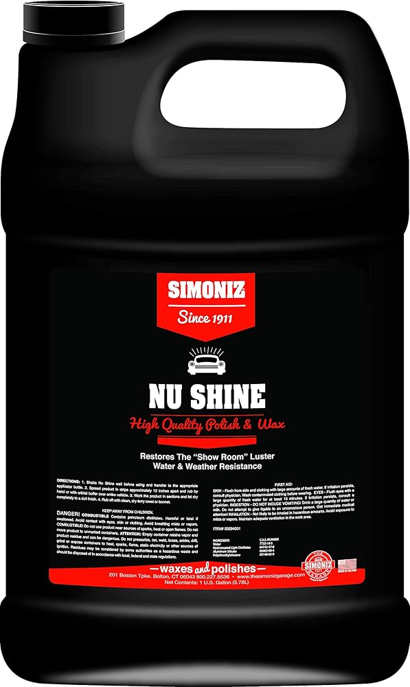 If you have ever been frustrated by hard to use waxes and polishes then this one is for you. Simoniz Nu Shine is synthetic polymer polish that doubles as a cleaner wax which is designed to lightly polish and decontaminate the surface of your car. This smooths the edges of minor surface imperfections which increases visibility and clarity. We formulated Nu Shine with ease of use and long lasting protection in mind. It can be used as an express wax or in full paint restoration projects. It is also excellent on dark automotive finishes. This formula is purely synthetic which means it is much more forgiving than pure carnauba wax when applied in less than ideal conditions such as in hot climates. While we always recommend waxing and polishing cool, dry surfaces Nu Shine will not bake on if applied in the sun and it will not leave any white residue on unpainted surfaces. It is ridiculously easy to work with and will last up to 90 days under normal driving conditions. Call it a wax or call it a polish. Either way we love the easy like-nu shine and we're sure you will too.