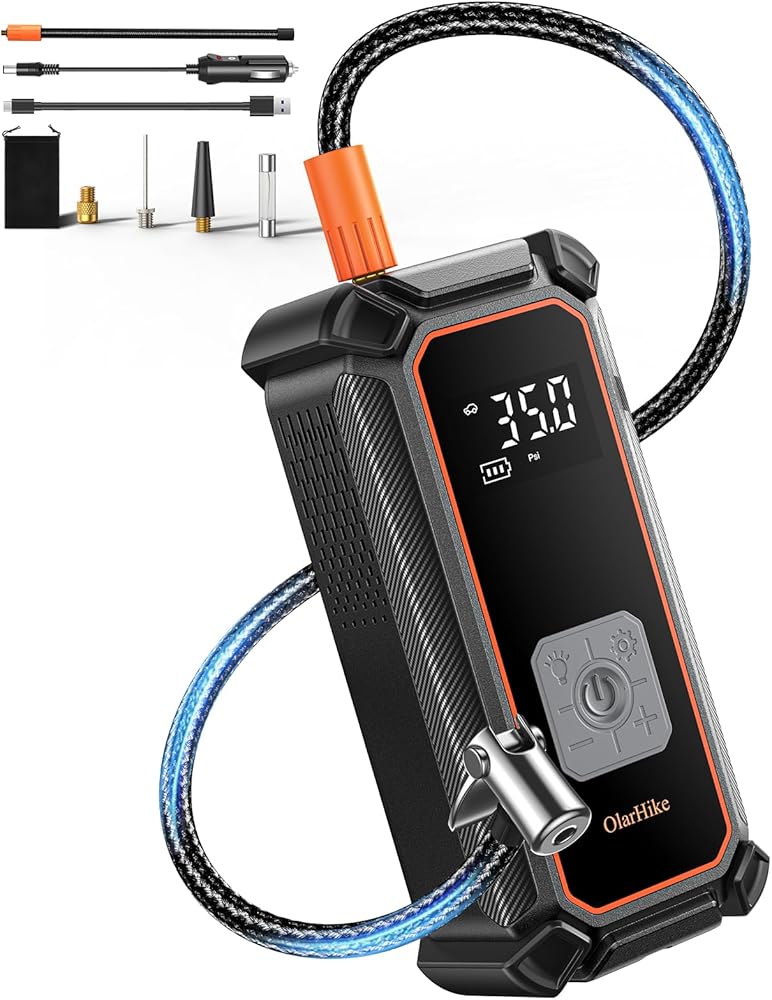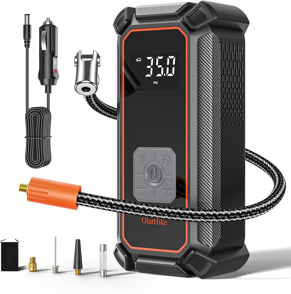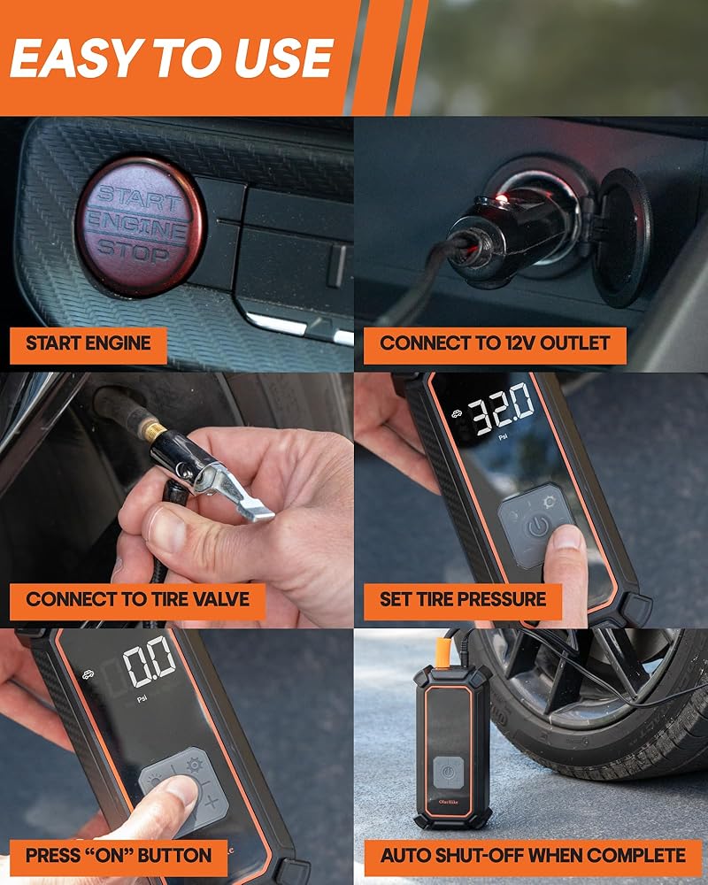 OlarHike 12V DC Corded Electric Tire Inflator Portable Air Compressor, Auto Air Pump for Car Tires, Tire Inflator with Digital Pressure Gauge, Smart Pump with LED Light,Orange