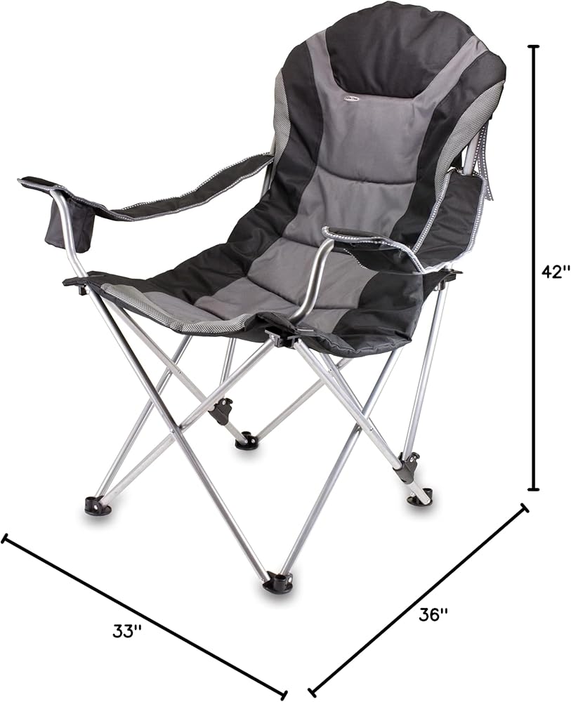 This NCAA Reclining Camp Chair features a folding steel frame that can hold up to 300 pounds, a padded seat and back rest covered in durable 600D polyester canvas with your favorite team's logo. Three seating positions add to this chair's functionality, along with the adjustable armrests, an insulated drink holder in the right armrest, a large zippered pocket on back of chair, and a matching storage tote with carrying strap. The Reclining Camp Chair is great as a spectator chair at sporting events or for outdoor activity such as lounging by the lake or beach, camping and fishing. Throw this chair in the back end of the car, so you are never without it.