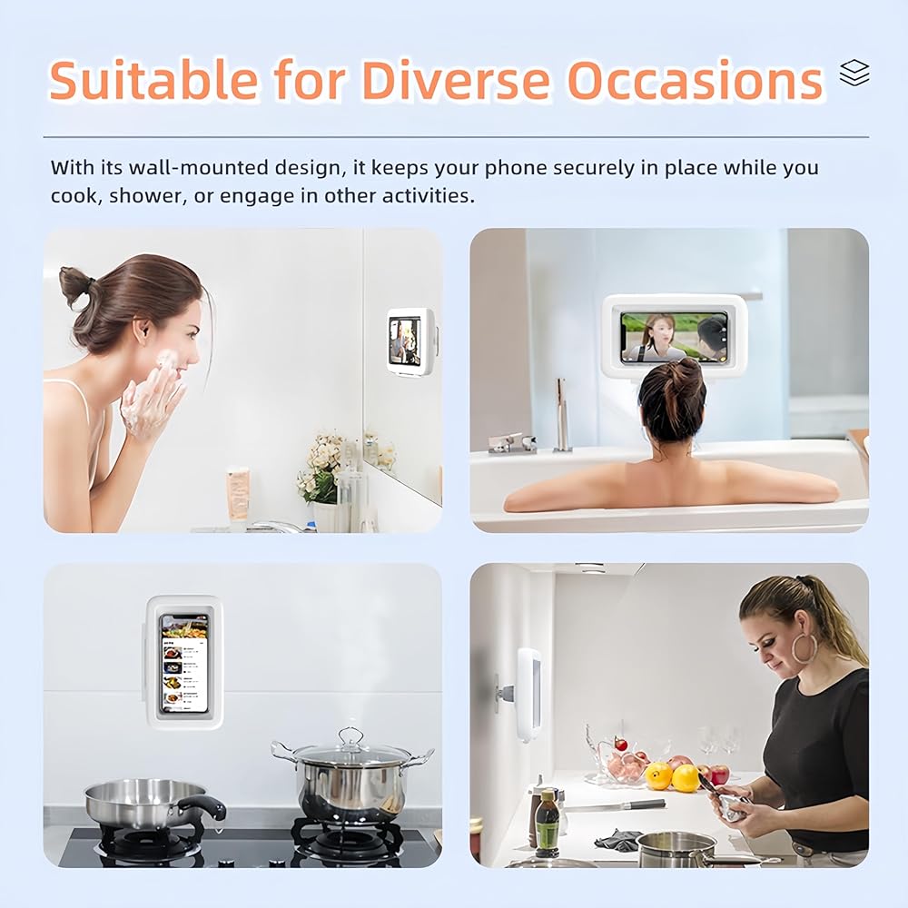 Versatile Mounting Solution: Our 480° Rotating Phone Holder provides a versatile solution for hands-free use of your phone in the kitchen, bathroom, or any other area where you need easy access to your device. With its wall-mounted design, it keeps your phone securely in place while you cook, shower, or engage in other activities.