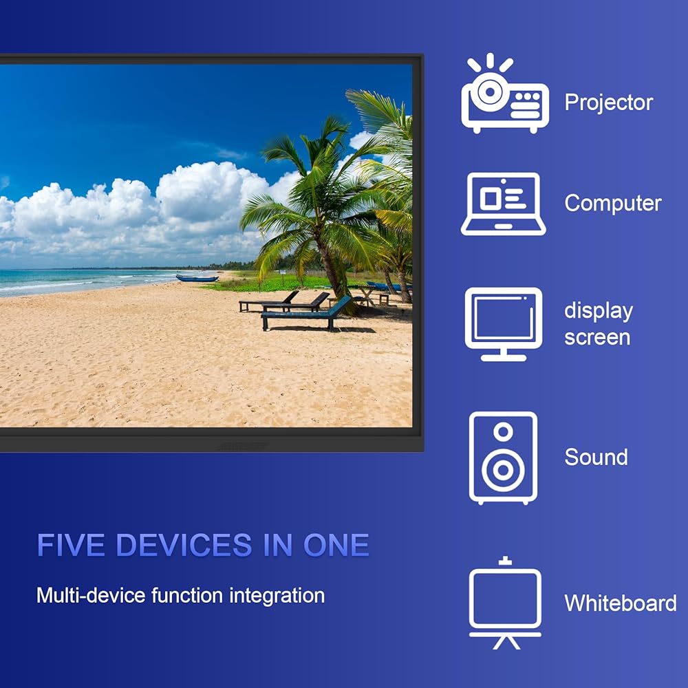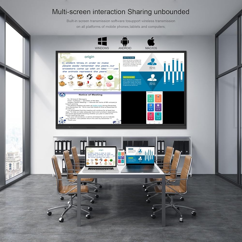 The smart whiteboard is an efficient meeting and real-time sharing tool that is compatible with various video conferencing software. It features a dual system interactive whiteboard, and multi-touch function, and supports multiple people writing at the same time. it serves as an excellent alternative to traditional projectors, providing clear images, text, and videos even in large spaces with high ambient light. The board also has wireless screen projection and multi-screen interaction functions, making it easy to transfer files between devices and improve collaboration efficiency. Easy to use, the All-in-One Computer electronic whiteboard is an ideal solution for office, classroom, school, or business presentations.