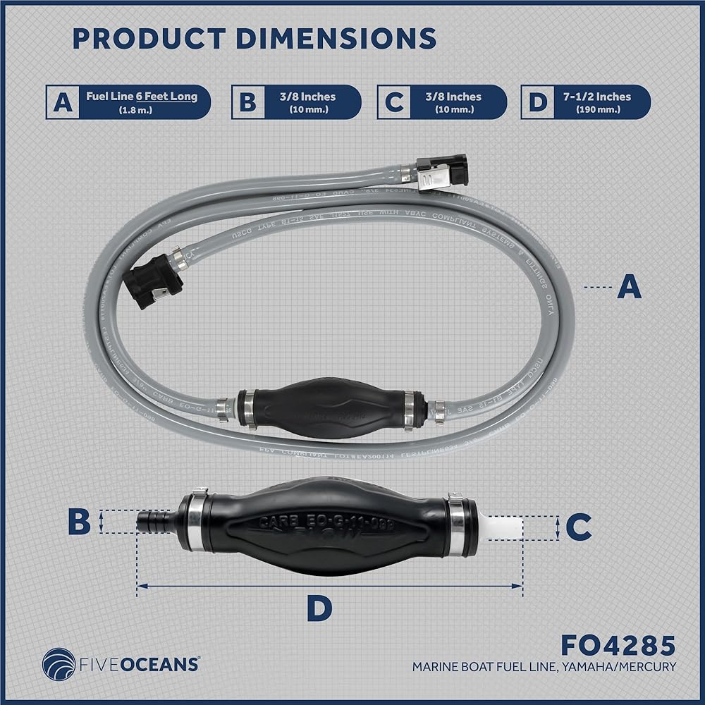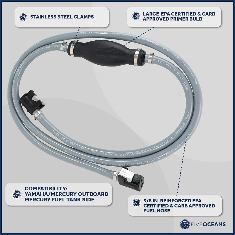 DURABLE MATERIAL: Engineered and designed with marine-grade material. This Fuel line is weather and UV Resistant. Meets USCG type B1-15 SAE J1527 and ABYC Accepted Standards. Reinforce Hose Approved by Environmental Protection Agency EPA and CARB regulations. FIVE OCEANS, 40 Years Developing High-Quality Marine & Outdoor Products