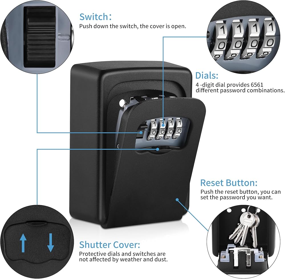 Convenient to change code - 10000 kinds of codes you can combine by yourself,ensure the security of the key.The material and protective cover design of the outdoor key lock box ensure that it is corrosion resistant, waterproof and dustproof.