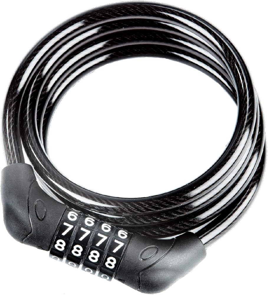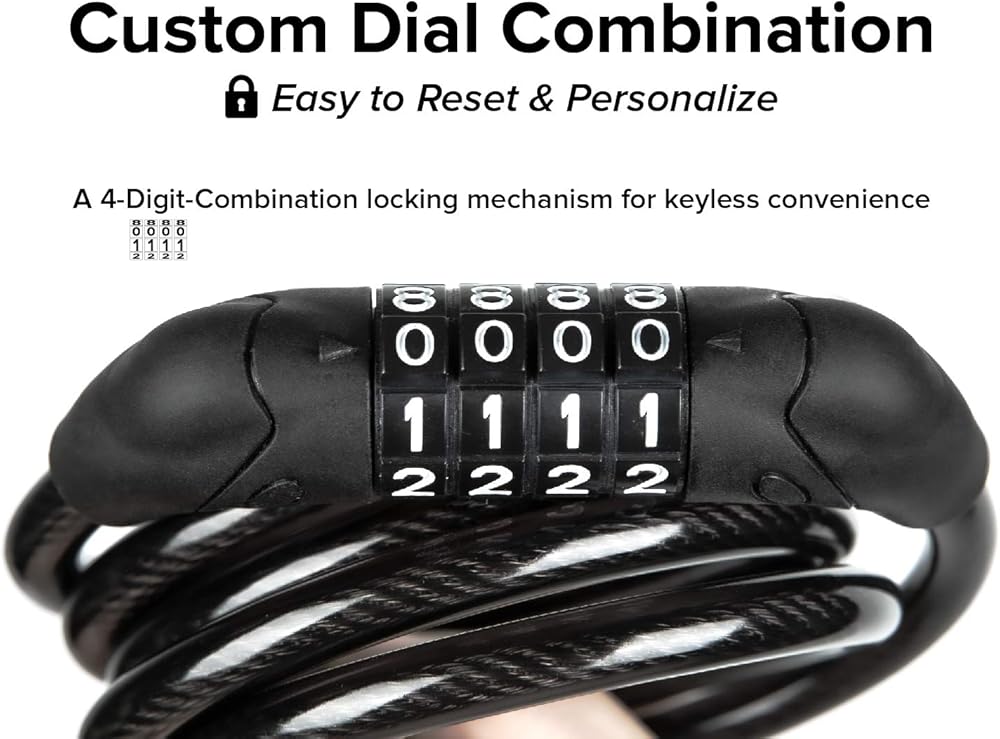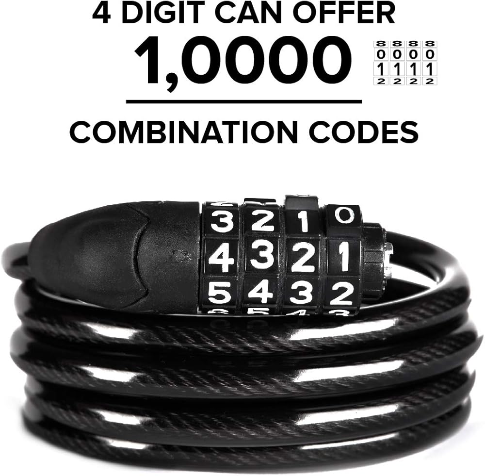 1.Protecting your scooter, bicycle, or other valuables against theft. 2.The protective coating helps prevent scratching and the flexible braided steel cable for strong cut resistance. 3.The 4-digit combination allows 10,000 possibilities. Making this lock nearly Impossible to crack. Set your own combination in a strong and complicated mechanism. How to set your own password: 1.Open the lock by entering the number combination on the marked number pad, and pull the locking bolt out. (The lock combination is preset to "0000") 2.To select a new number combination, turn the reset ring 90 degrees, then select the number combination you want. 3.Turn the reset ring back after you have selected the combination. 4.Now the lock can be opened with the new number combination. 5. The lock combination can be changed again at any time by repeating the above steps. Please keep your new combination recorded in a safe place in case you forget it.