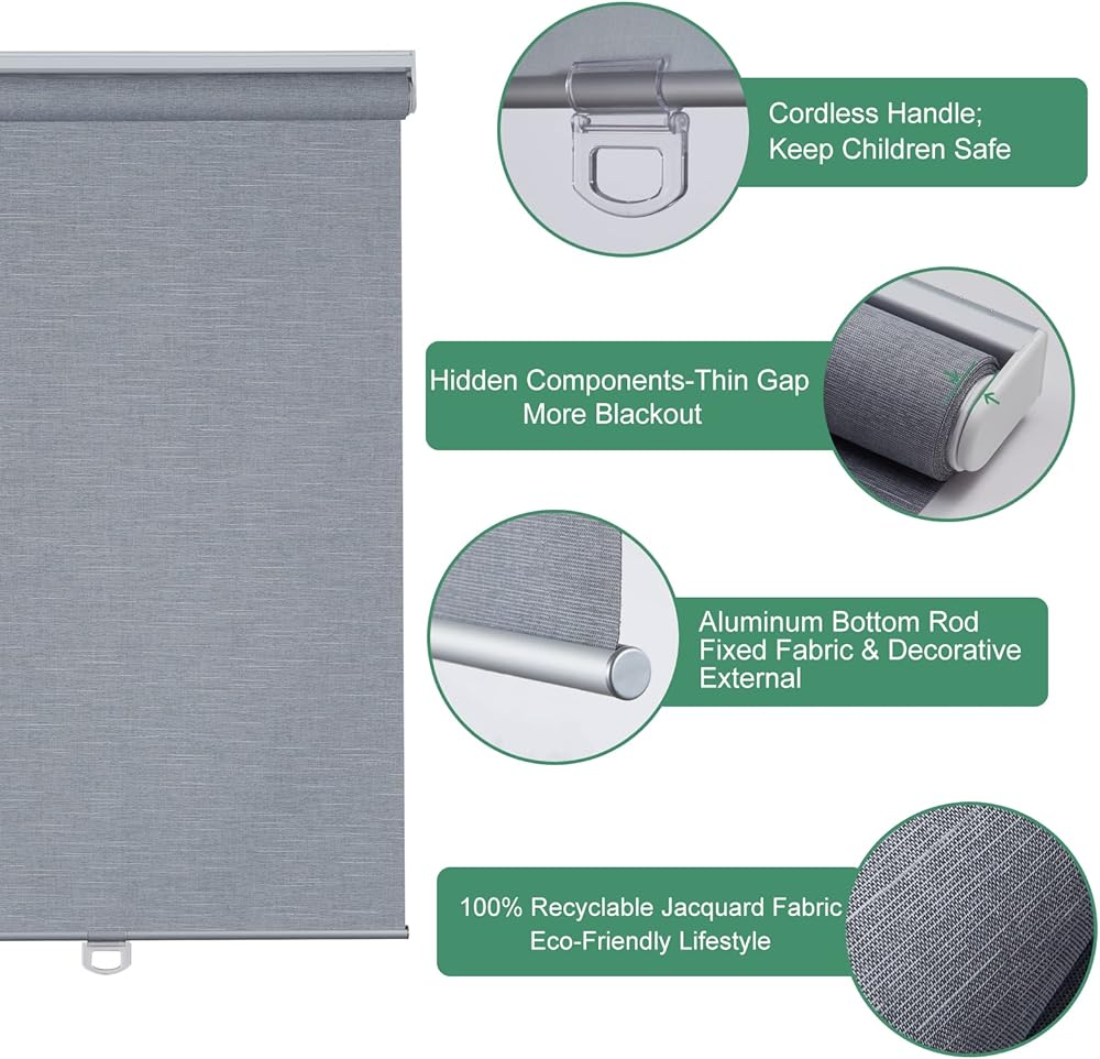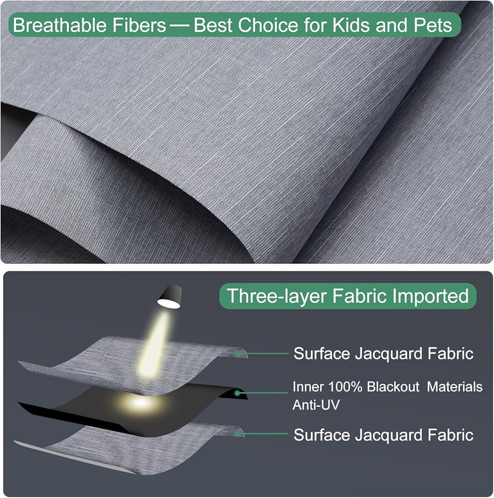 【Excellent Fabric】Our cordless shade is made of environmentally friendly three-layer fabric. 100% blackout, 100% environmental health and 100% anti UV. Same jacquard fabric on both sides. The middle thick layer can make room dark and help block out sun and heat. It also helps with temperature control.