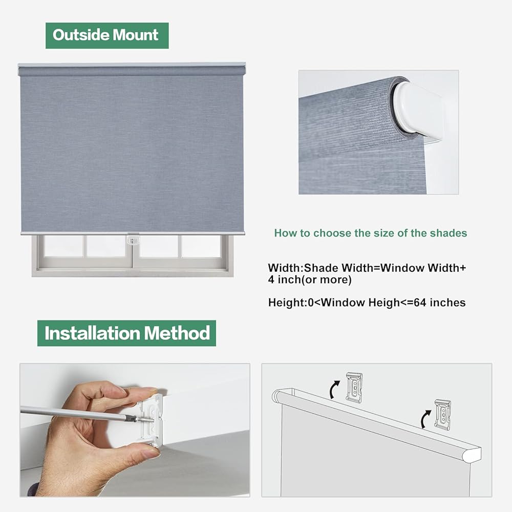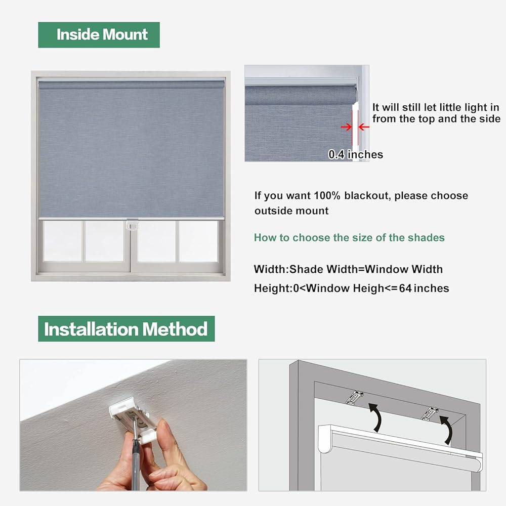 【How to choose a correct size to fit? Example your window meas 23" width x less than 64" Height.】INSIDE MOUNT: Window Width and Height is Blind Width and Height. Blind Width=23"; Blind Height=64". OUTSIDE MOUNT: Plus at least 4" is blind width, blind width=23"+4"=27"; Plus at least 4" is blind height, blind height=64"+4"=68".【Pls Note】Fabric width will be 0.8" narrower than the size of the blind.