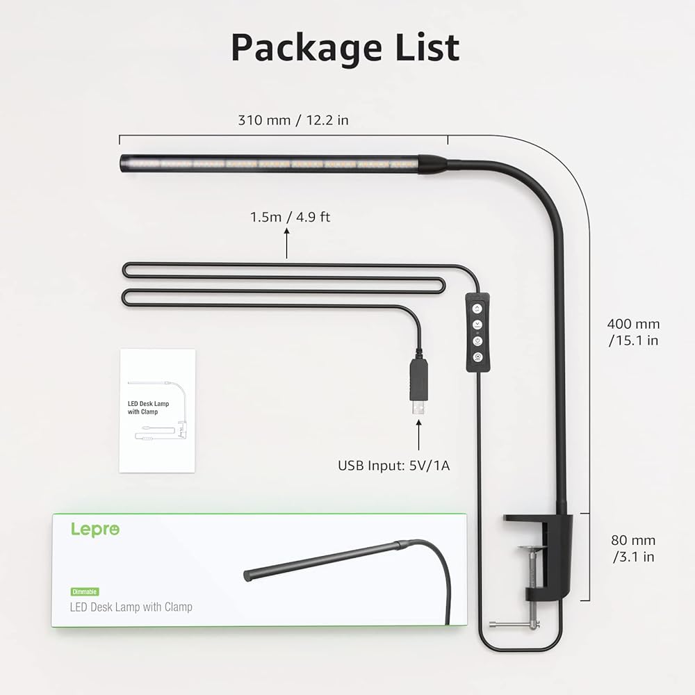 Lepro Clip on Desk Lamp LED Reading light Dimmable USB Small Clamp Lamp with 3 Color Modes 10 Brightness, Adjustable Flexible Gooseneck Table Light for Bed Headboard, Nail, Home Office,Computer(Black)