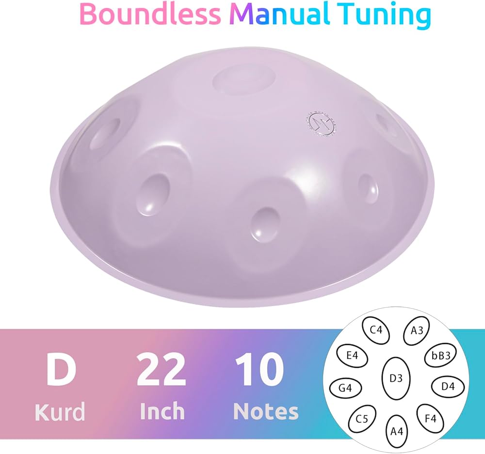 BeatRise 22 Inches 9 Notes Handpan Pre-tuned in D Kurd: 1 Center Note (Ding): D3, and 8 Notes: A3, bB3, C4, D4, E4, F4, G4, A4.