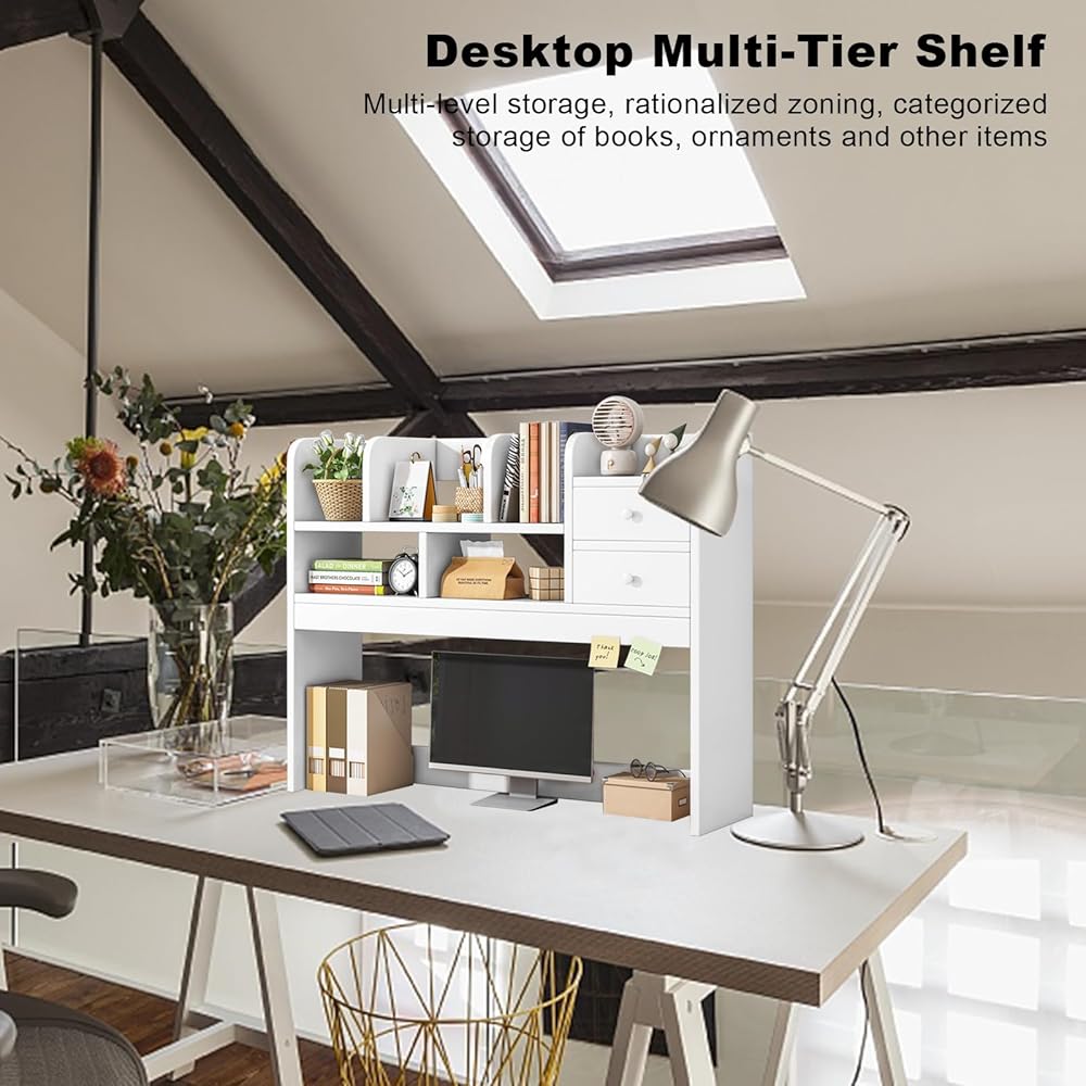 【Wooden And Multipurpose】The 3-Tier Wood Desktop Bookshelf for Computer Desk is made of high-quality wood material, which is sturdy and durable. The bottom layer is 17 inches tall and can hold laptops and other higher-sized items.Made of rugged wood, this desk bookcase also comes with private drawer storage, ensuring versatility and long-lasting performance and a natural, timeless look.