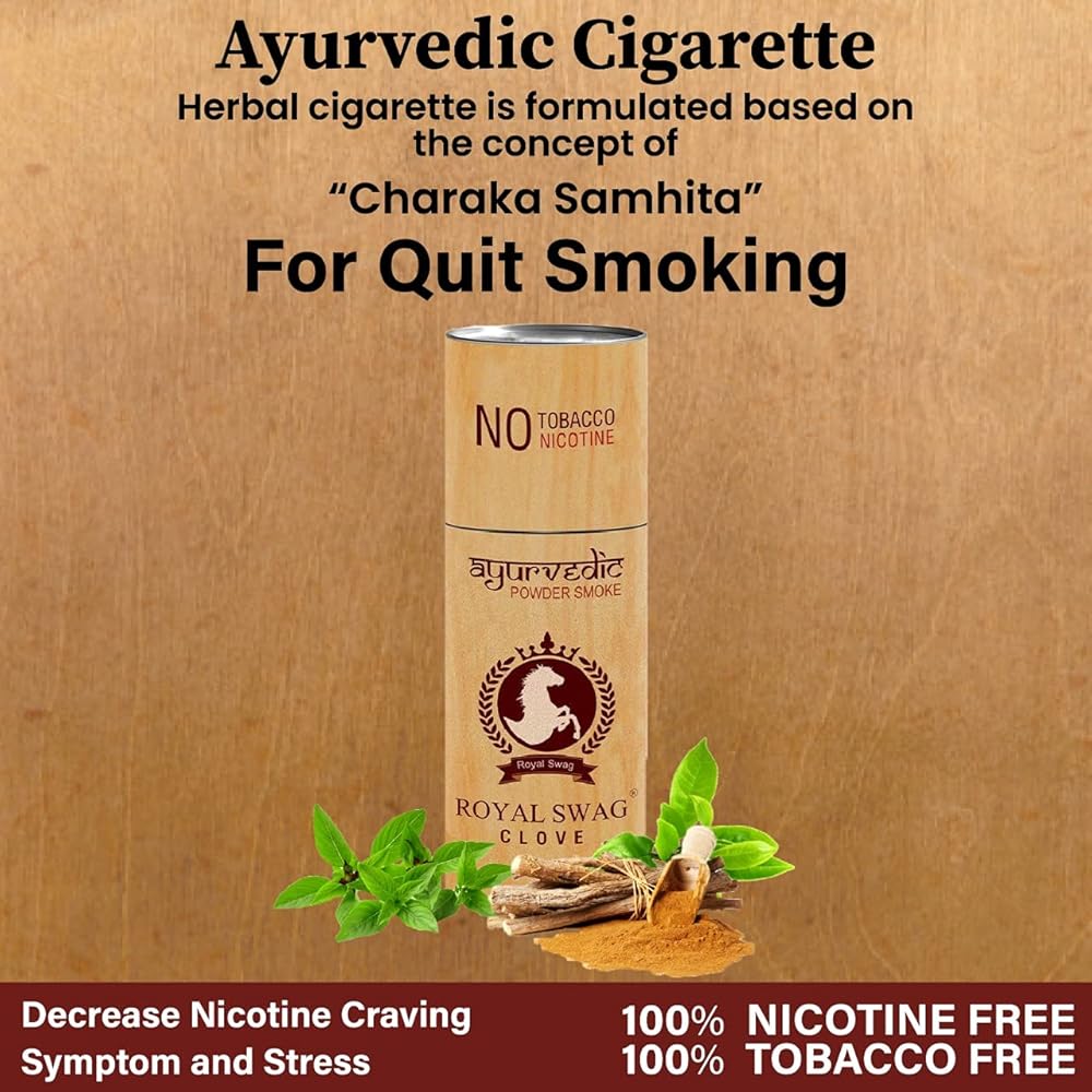 ROYAL SWAG Ayurvedic and Herbal Cigarettes are 100% Tobacco free and Nicotine free. These are made with fine ayurvedic and natural herbs like clove, tulsi or holy basil, cinnamon, mulethi and green tea. It is 100% natural, chemical free and additives free. It contains no artificial colour. It is non addictive (Made in India) product.