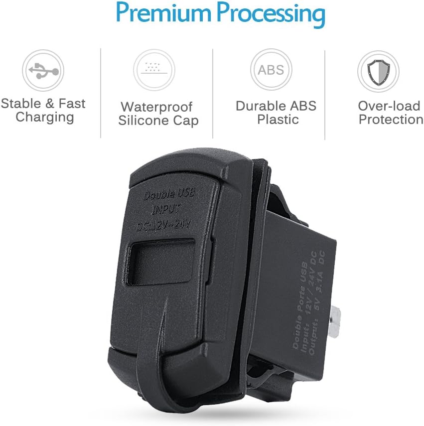 Simple, small and elegant design. Environmental ABS material Dual USB ports:input: DC12V/24V; output: DC 5V 4.2A