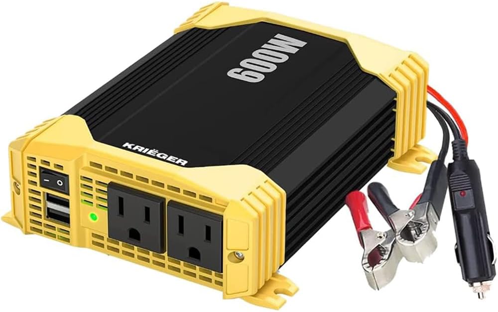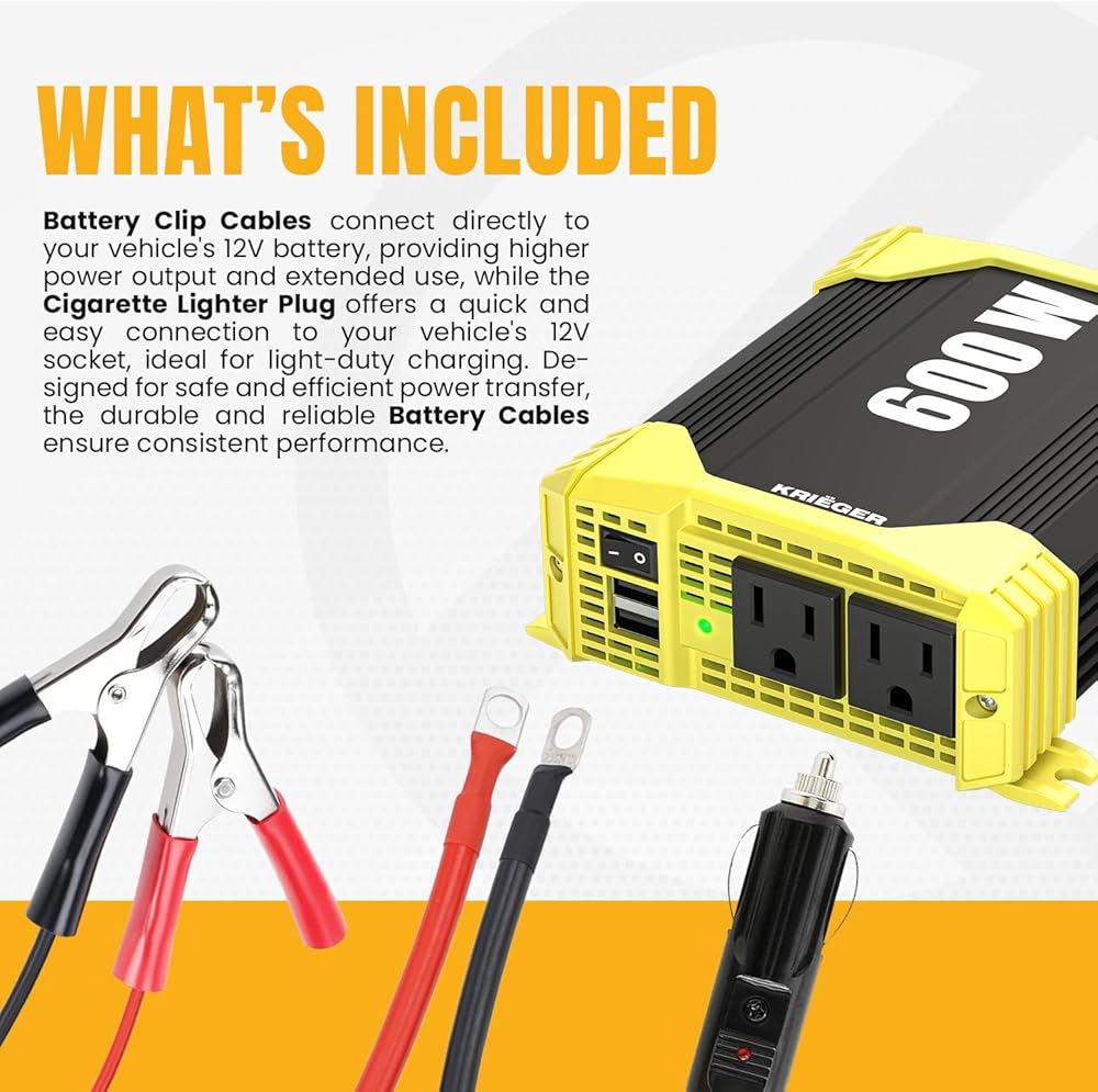 K KRIËGER 600 Watt Power Inverters for Vehicles, 12V to 110V, Car Charger with Plug Outlet, Modified Sine Wave, 2 AC Outlets, USB Ports, Cigarette Lighter & Clamps - ETL Approved Under UL STD 458