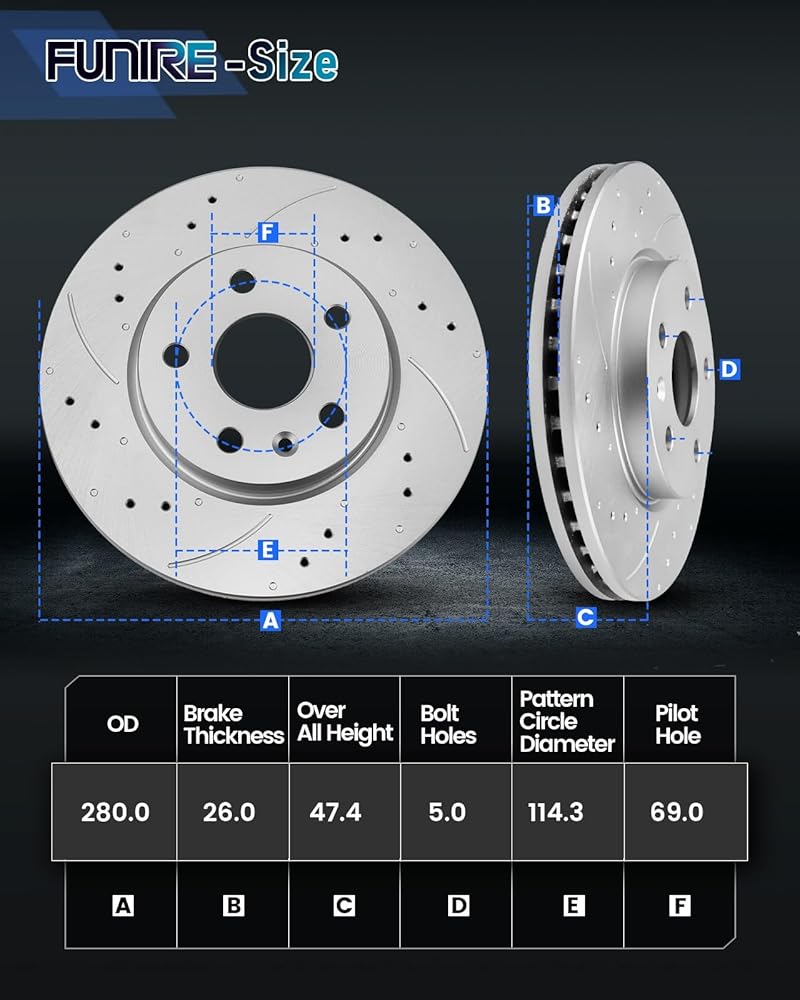 [Brakes Kit Includes]: 2 x front drilled and slotted brake rotors-31584 + 4 x front ceramic brake pads (hardware included) -D1397-8505. The diameter of this brake rotors is 280mm(11in)