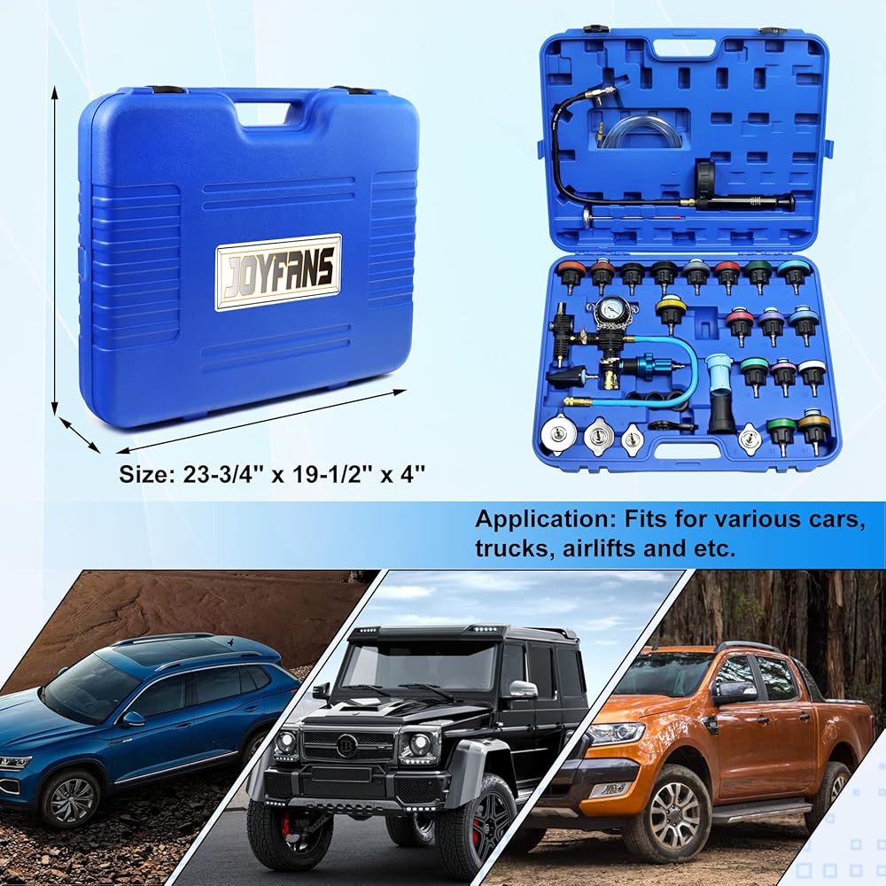 Saviour of Your Radiator: If you find your car's cooling system runs unsmoothly, high engine temperature and increased wear make it difficult to start the engine, you may have a sick water tank that badly needs treatment. If you're looking for a reliable solution, this JoyFans first-grade 33pcs radiator pressure tester and coolant vacuum refill kit is right up your alley. Set allows users to easily solve leak source detection and coolant purge & refill issues.
