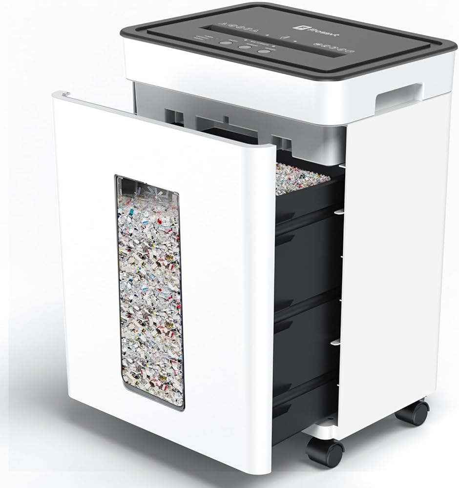 12-Sheet Shredding Capacity: The micro-cut shredder up to 12 sheets(A4 Paper Size, 75g/16.5lb) at a single pass, shreds paper into tiny particles measuring5/32” x 15/32” (4mm x 12mm) and reaches P-4 high-security level; shreds credit cards and staples as well