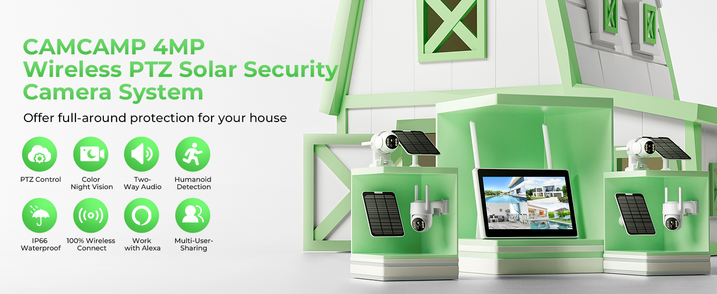 📲【APP REMOTE ACCESS+ MULTIPLE USER SHARING】 Support remote access and control of the ptz wireless solar home security system via the free App CloudEye 365, and you must plug the nvr screen into your home router first. Besides, you can share the ptz solar surveillance camera's access rights with your family through the APP, and multiple users can get real-time viewing at the same time to protect your safety and property together.