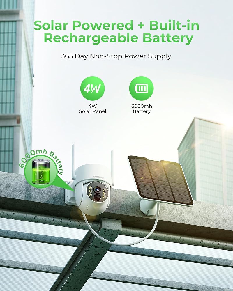 🪐【360° ANGLE COVERING+ 2 WAY AUDIO +IP66 】 The 340° Pan/90° Tilt/5X Digital Zoom solar security cameras cover a 360° monitor area without blind corners. Built-in noise-canceling microphone and speaker, allow you to have a high-fidelity two-way talk with people within the monitoring range. IP66 waterproof design allows cameras to work in temperatures from -13°F to 122°F (-10°C to 50°C), and operate perfectly during rain, sun exposure days, and extremely cold weather.