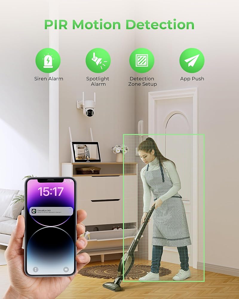 🌈【4MP HD COLOR NIGHT VISION + SMART MOTION ALERT】 The wireless solar home security system is designed with an advanced CMOS sensor and spotlight, which delivers 4MP(2560*1440P) super clear full-color images in the dark night. The smart PIR motion detection tech reduces false positives, and the ptz solar outdoor security cameras will automatically record when triggered, you will receive real-time alerts on the NVR monitor or your phone App, Email at the same time.