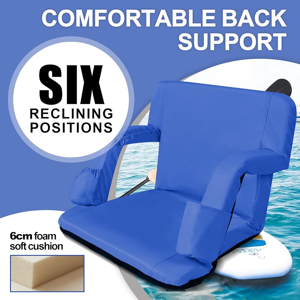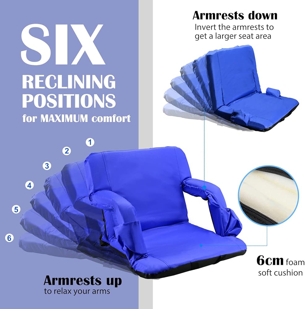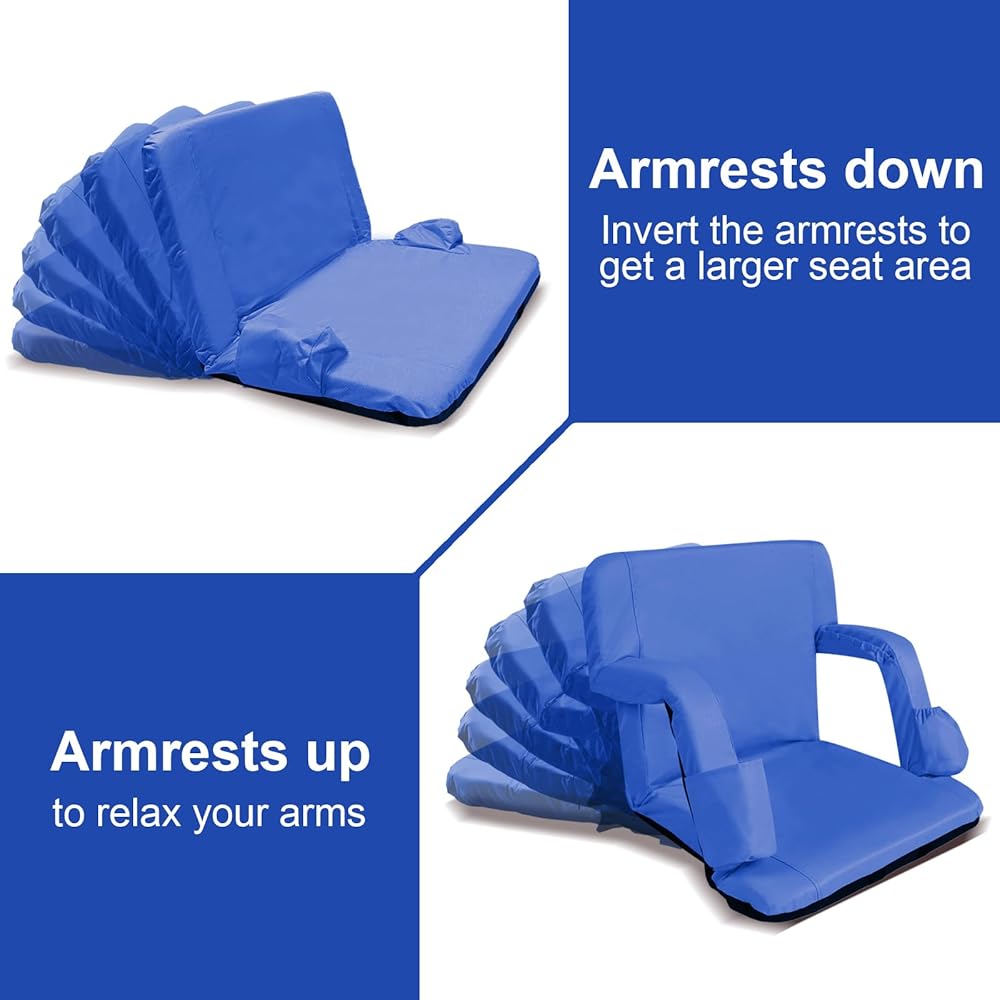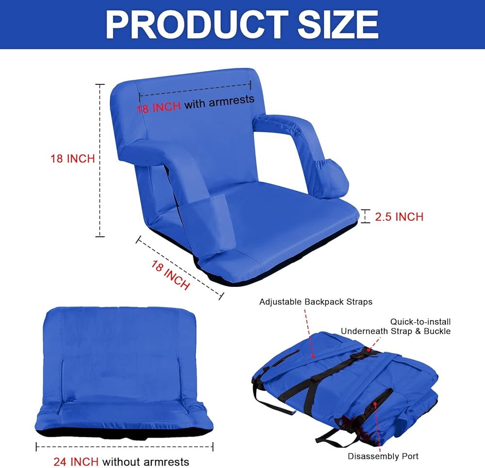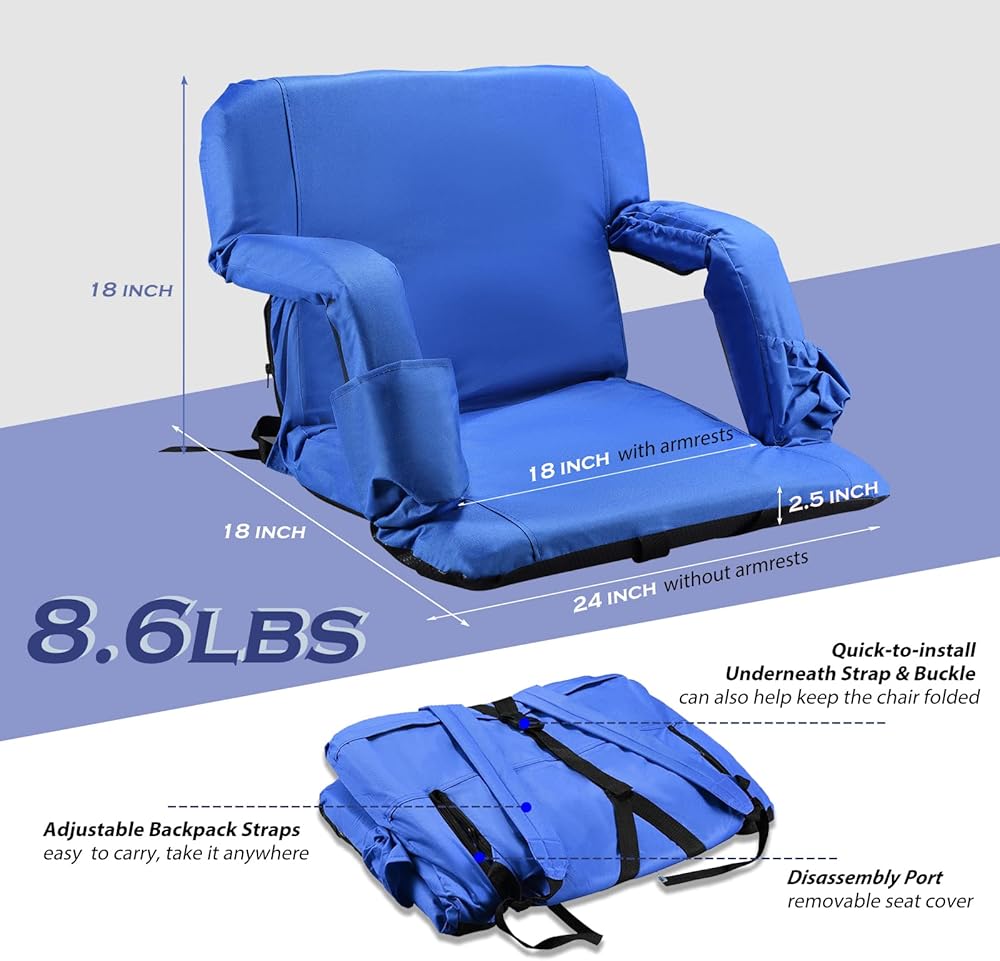 Stadium Seats for Bleachers with Back Support and Thick Padded Cushion,18" Extra Wide Portable Reclining Folding Chair with Optional Arms, 4 Pockets and Shoulder Straps,Big Size,Blue,2PCS