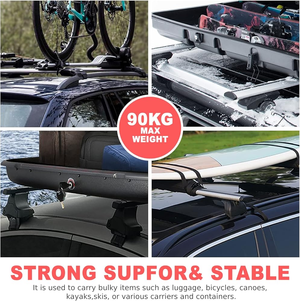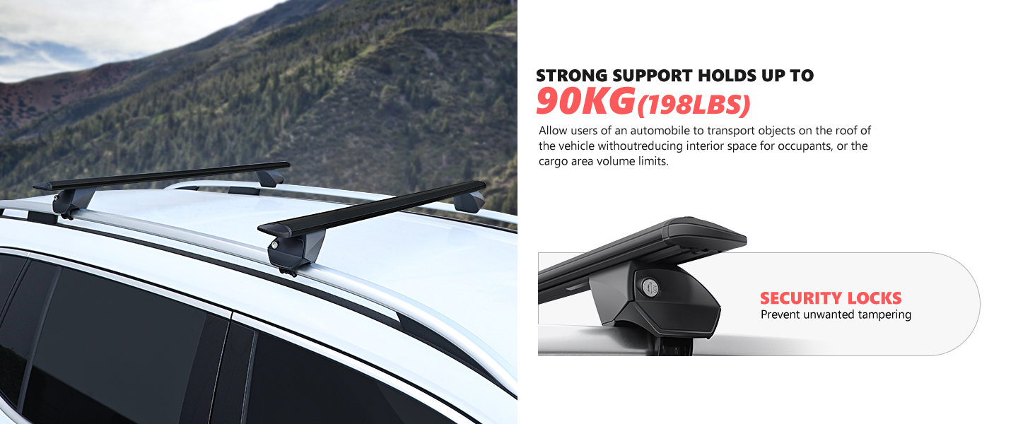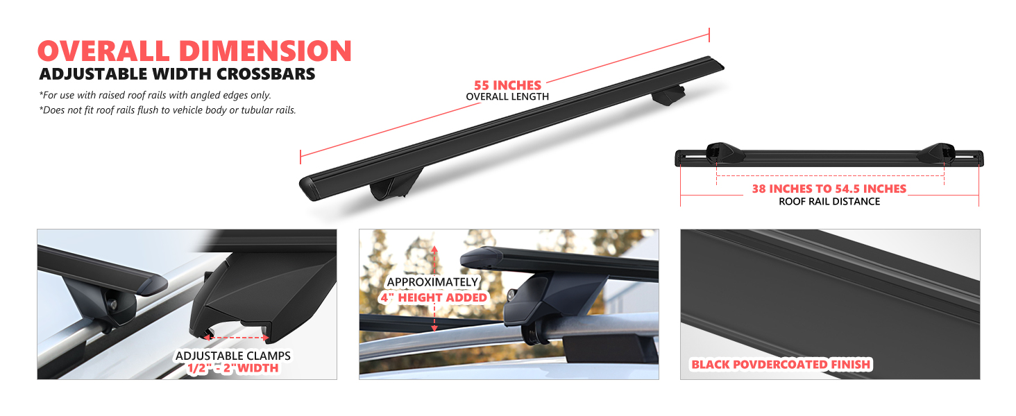 UNIVERSAL CROSSBARS - 55" overwall width, approximately 4" height added when installed, can withstand 90kg(198lbs) of weight; For use with raised roof rails with angled edges only. Does not fit roof rails flush to vehicle body or tubular rails.