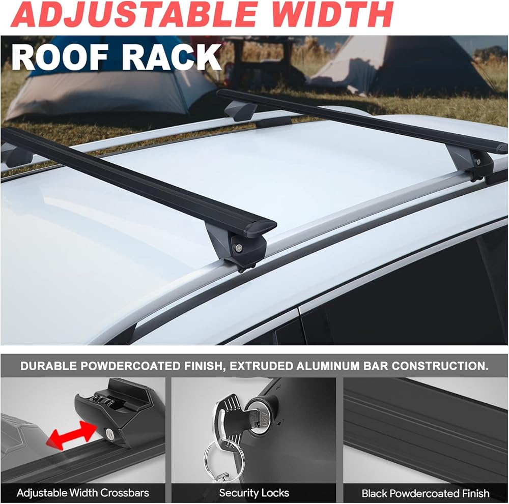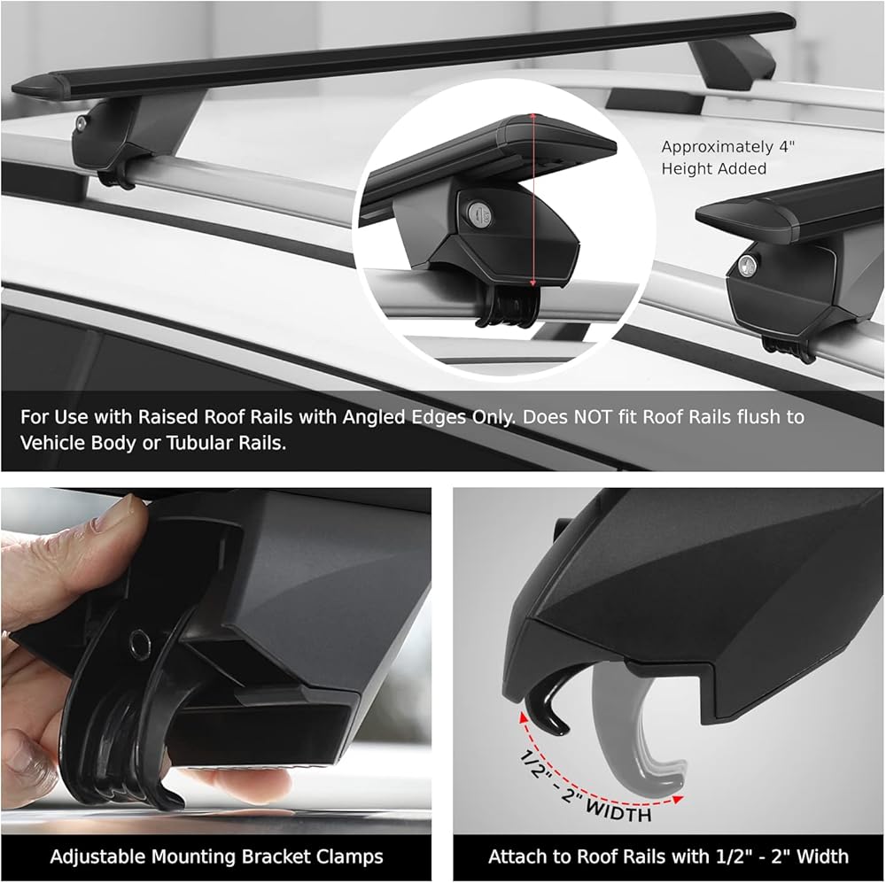 ADJUSTABLE SIZE - Adjustable mounting brackets can fit roof rail distance from 38" to 54.5" (measured from outer edge of each roof rail); Adjustable mounting bracket clamps can attach to roof rails with 1/2" - 2" width