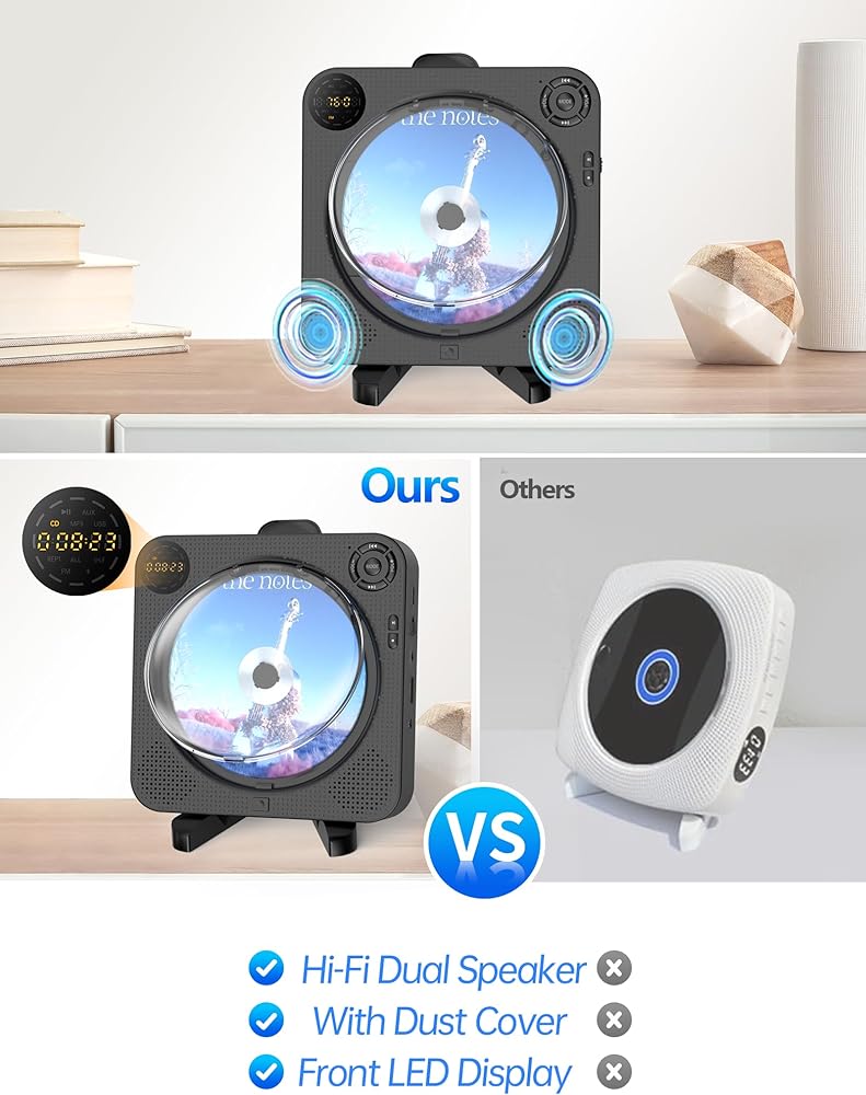 مشغل أقراص مضغوطة محمول، مشغل أقراص مضغوطة بلوتوث مع مكبرات صوت، مشغل أقراص مضغوطة صغير للمنزل مع جهاز تحكم عن بعد وراديو FM وشاشة رقمية ومقبس سماعة الرأس، ومشغل أقراص مضغوطة على الحائط يدعم AUX USB، أسود