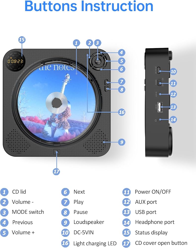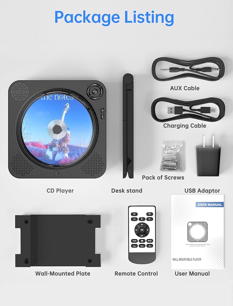 🌸【Package & Warranty】Package included: 1*compact CD player, 1*remote control, 1*pack of screws, 1* charging cable, 1* USB adaptor, 1*wall-mounted plate, 1*desk stand, 1*user manual. We offer full refund within 30 days and 12 months warranty. If you have any problem with this home CD player, please feel free to contact us and we will provide you with the positive solution within 24 hours.